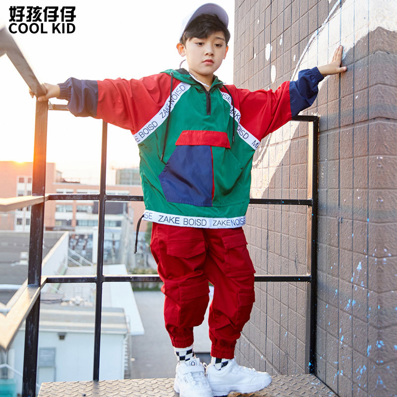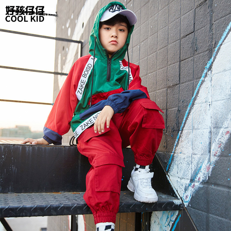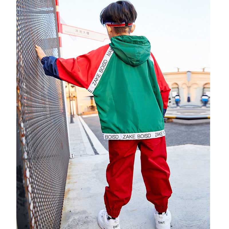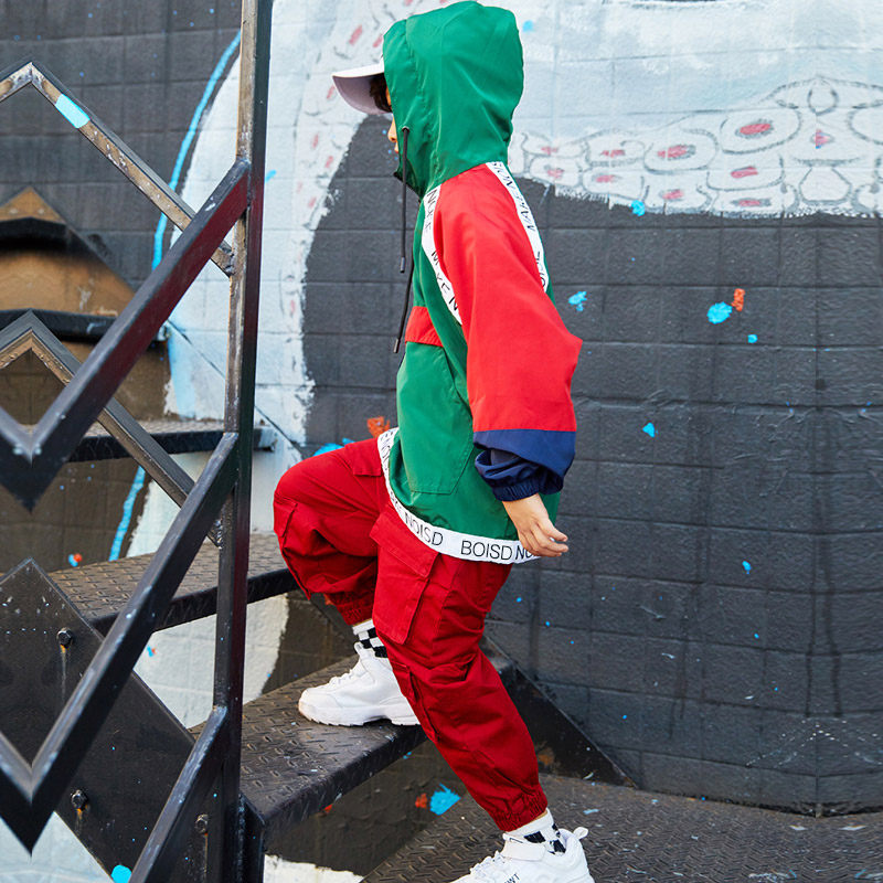 Color blocking jacket Red pocket pants Color blocking jacket Red pocket pants White baseball cap Color blocking jacket Color blocking jacket Red pocket pants Hair tie