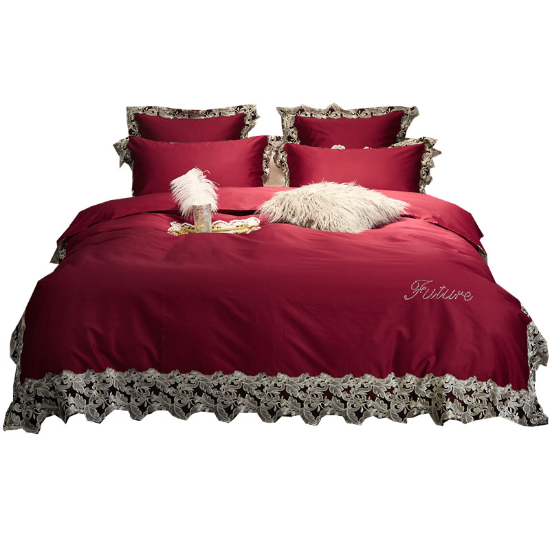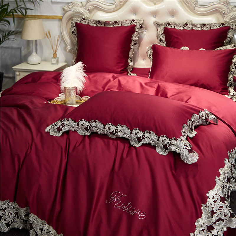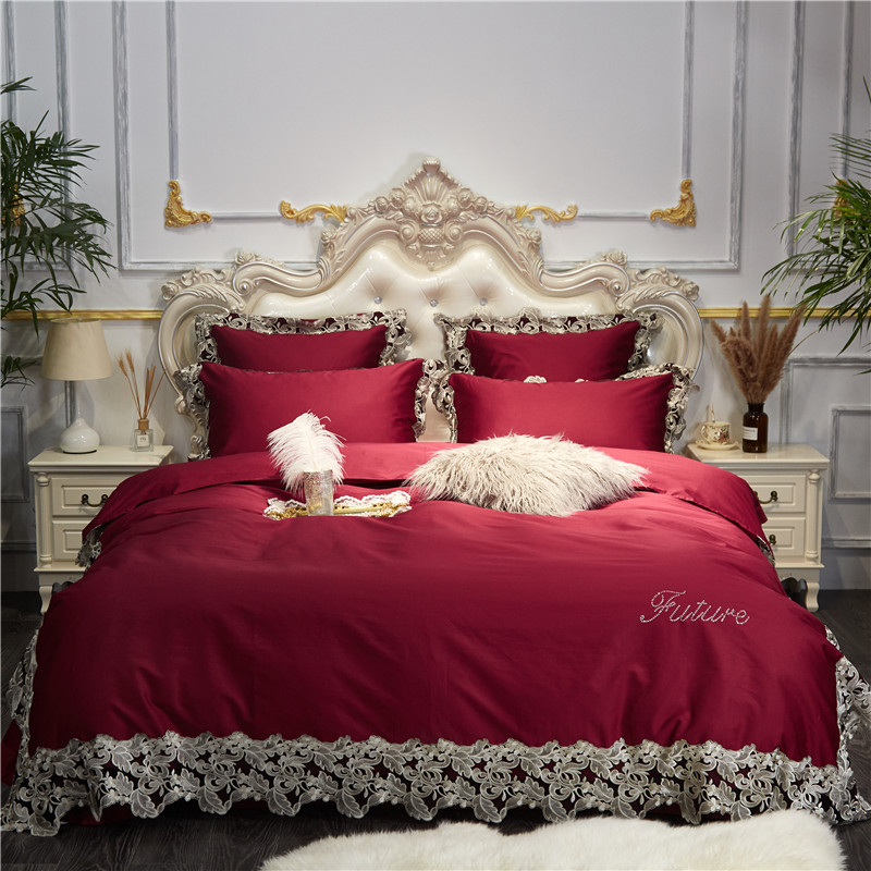 French high-end 80-count pure cotton lace four-piece set European-style long-staple cotton wine red six-piece set wedding 1 8m bedding