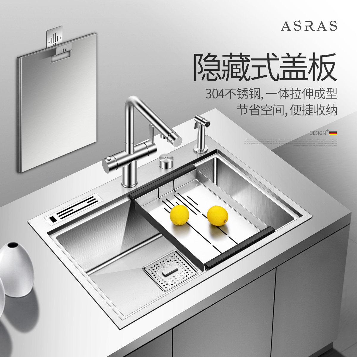 Arthas 304 stainless steel kitchen handmade sink with cover hidden dish wash basin with knife holder single sink package