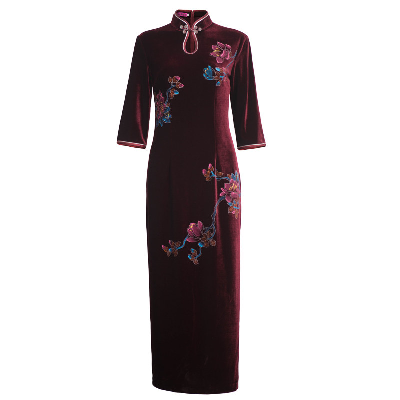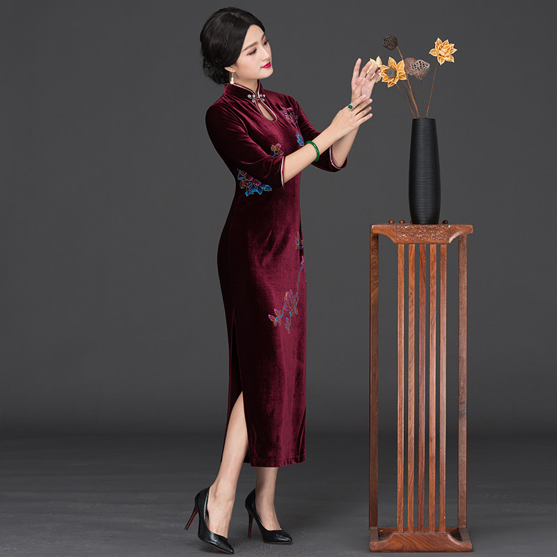 Huachu Classic Mom Qipao Big Size Dress Code Long Version Retro Improvement Daily Noble Elegant Middle Sleeve Gold Velvet Qipao Dress
