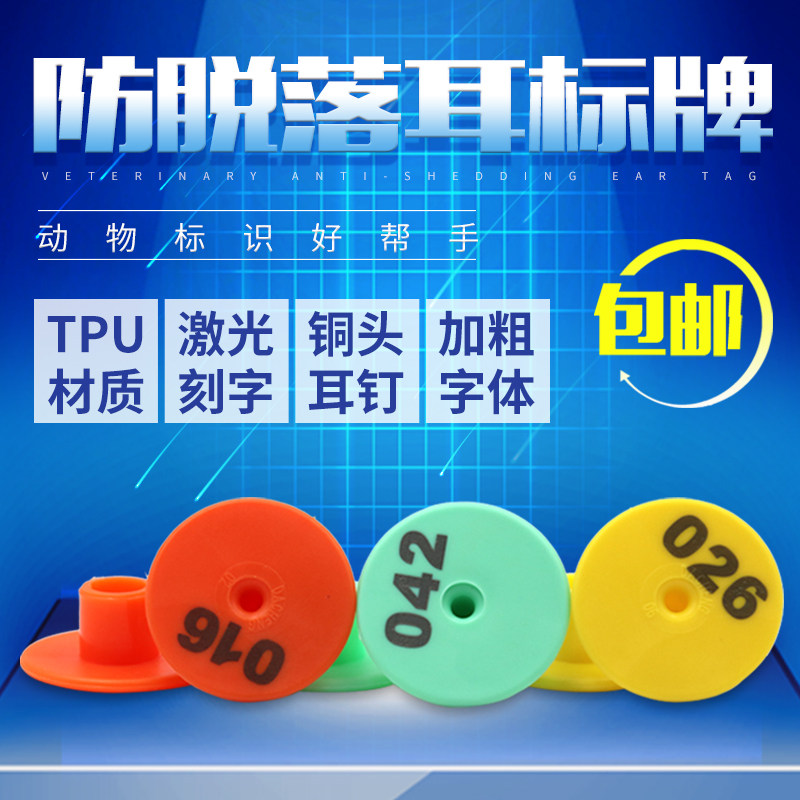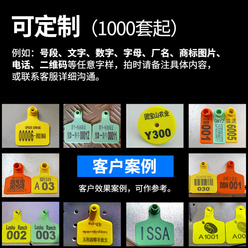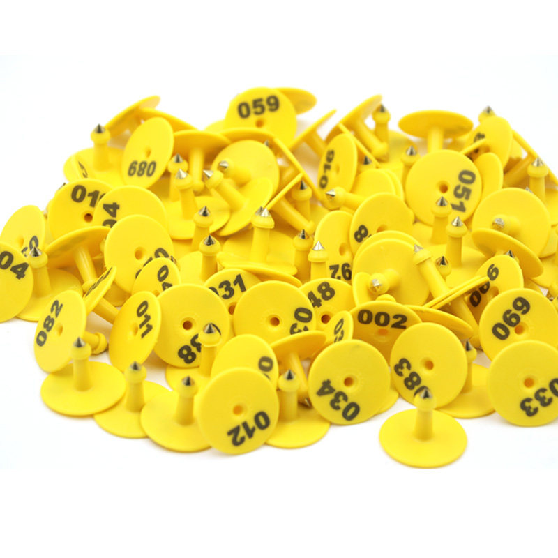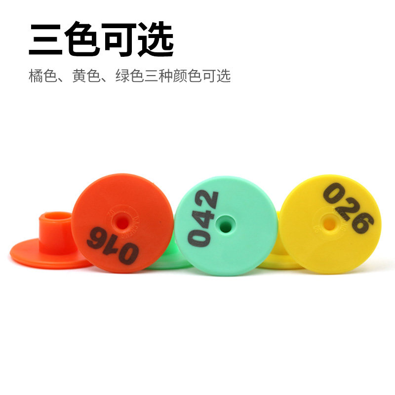 Yellow with character round ear tag 100 cover green with character round ear tag 100 sets orange color with character round ear tag 100 sets of round ear calibration done with 1000 sets of assorted male nails