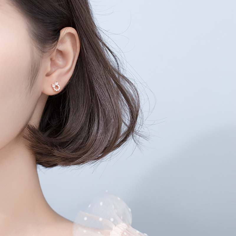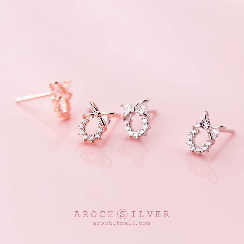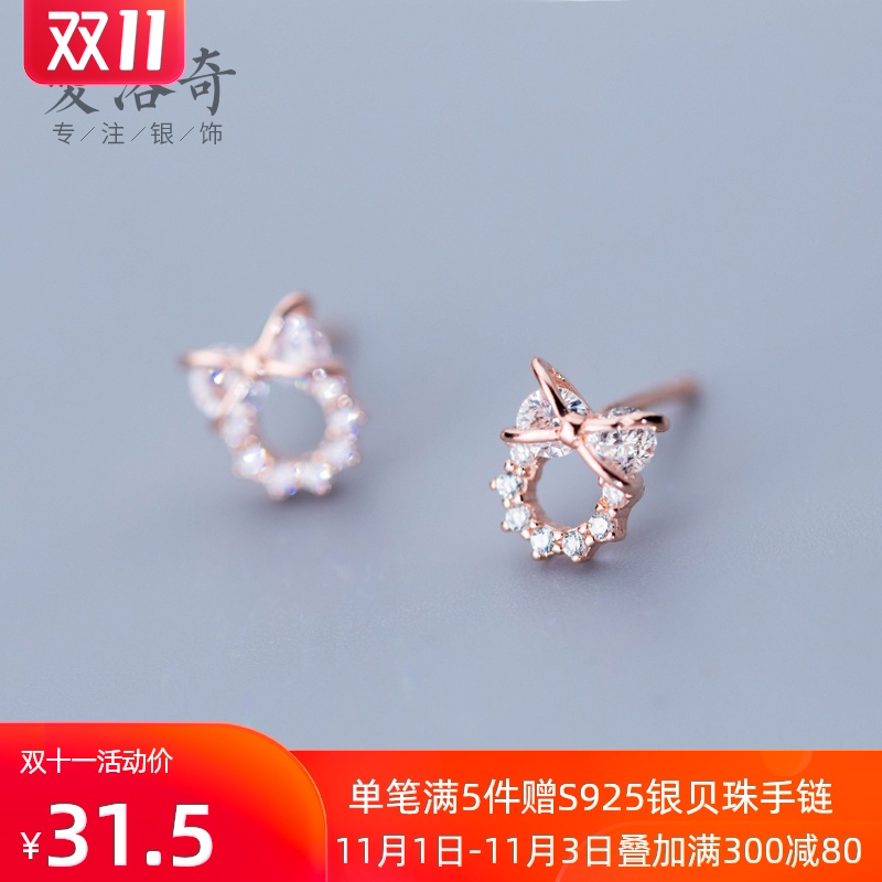 Love Rocky s925 silver ear stud female Korean version small fresh full diamond round cute bow small ear jewelry