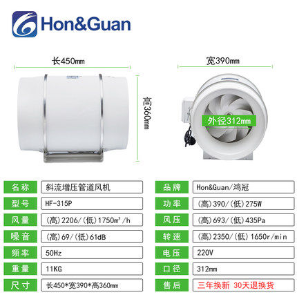 Hongguan High-power Piping Ventilator HF-315P Kitchen Exhaustventilator 12 Inch Powerful Industrial Row Blower