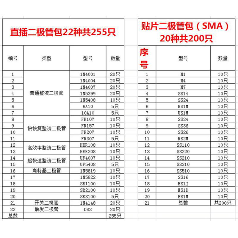 Commonly used in-line diode package 22 kinds of a total of 255 SMD diode package 20 kinds of a total of 200 pieces