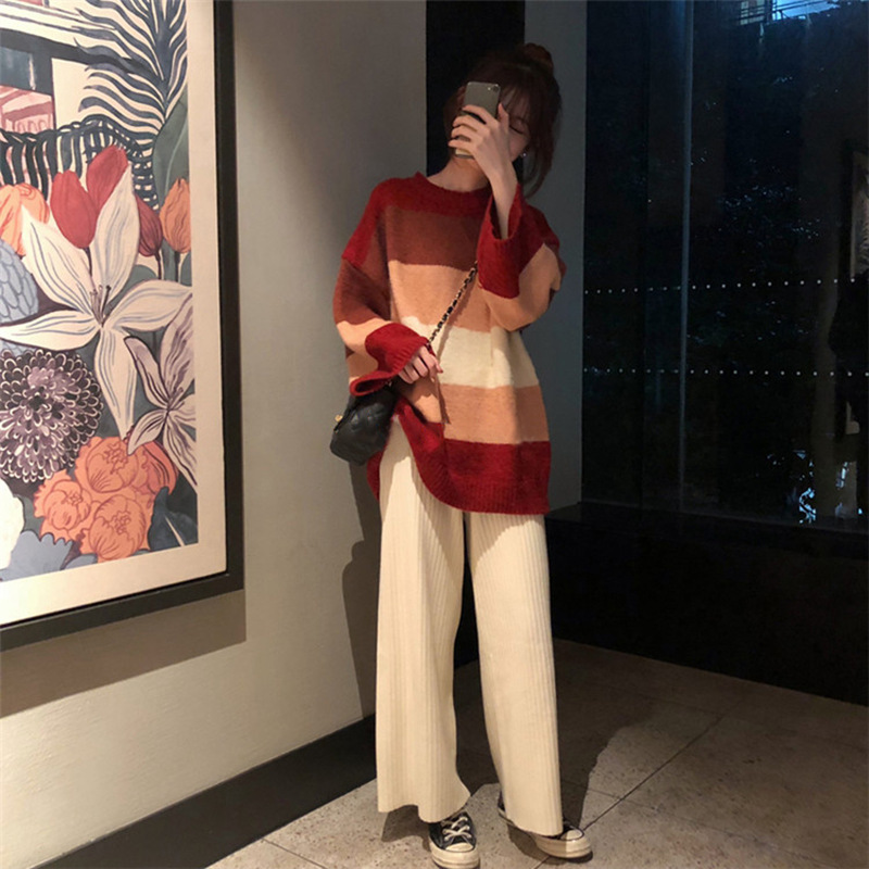 Red strip sweater beige pants single piece of red wool sweater single piece beige pants (fall suit women's two sets 2020 new wearing ride-hailing retro chic ocean pie
