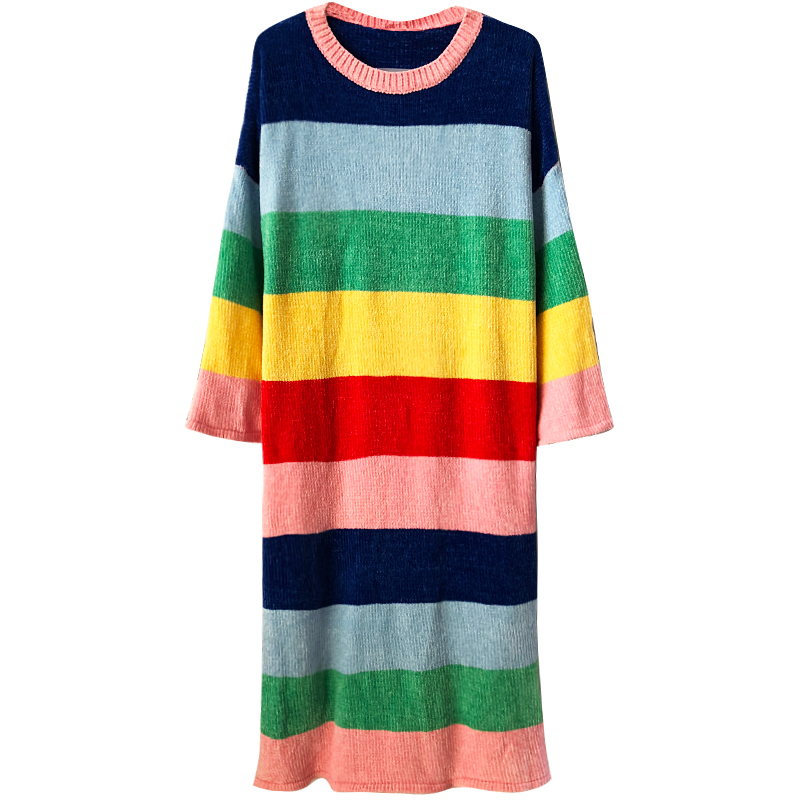 Rainbow striped wool nightgown women autumn and winter plus velvet soft cotton long sleeve loose long version of Snow velvet pajamas home clothes