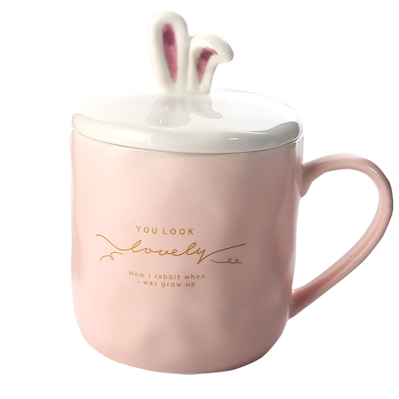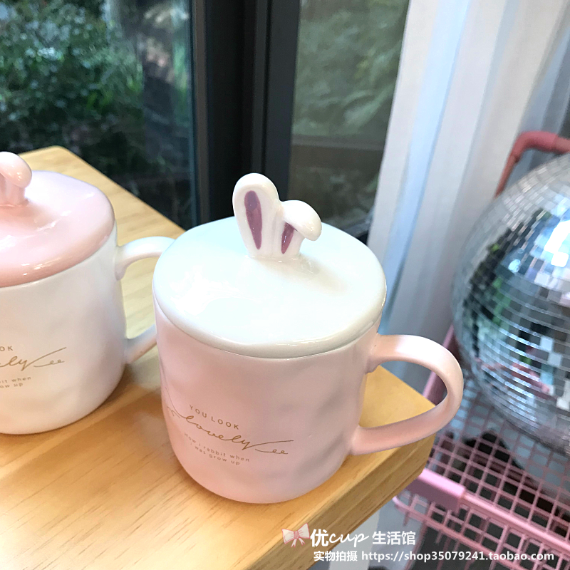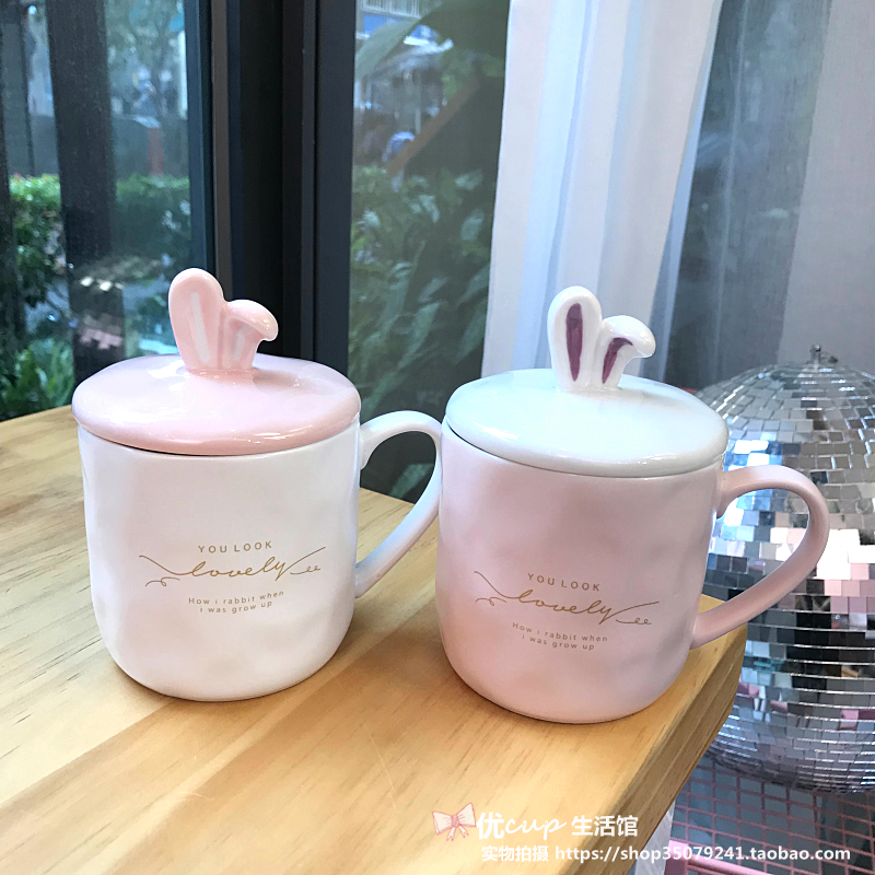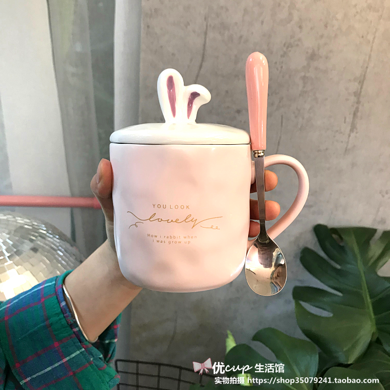 Girl's Heart Cup Rabbit Ear Mark Ceramic Cup with Cover Spoon Korean Female Student Cute Super Cute Milk Breakfast Cup