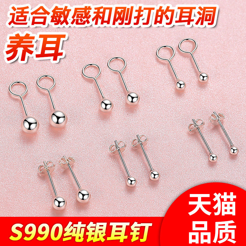 Ear needle female pure silver 990 gold ear nail not easy to sleep with no need to take off earrings male 925 ear bone nail bending hook