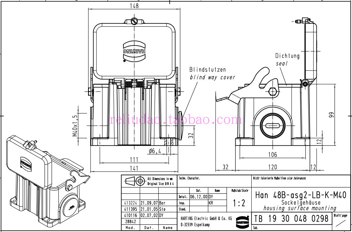 HARTING Connector 19300480298 High Base HAN-48B-asg2-LB-K-M40 original dress