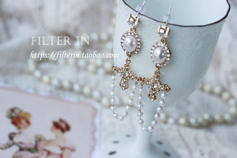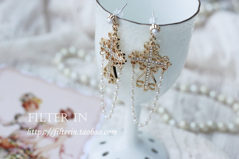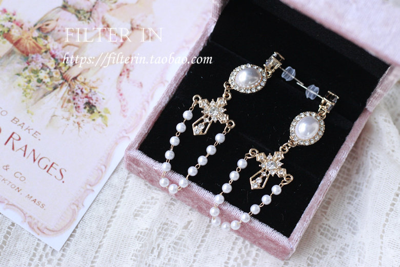 With filter, dreamy girlish feeling, retro carved hollow cross pearl tassel, 925 silver earrings and ear clips