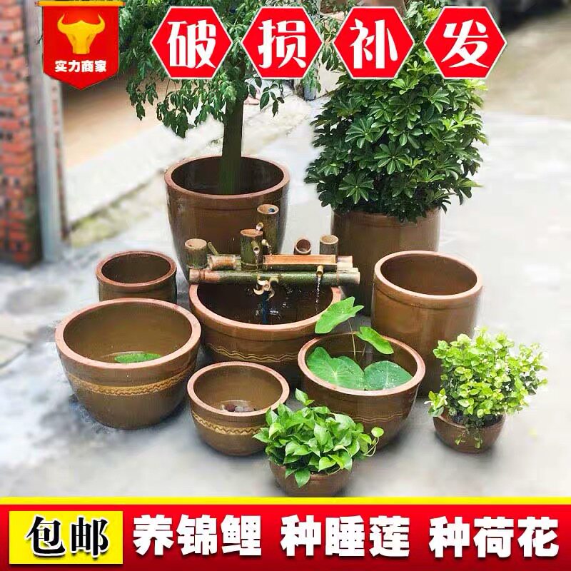 Water tank Ceramic large household running water fish Garden nap Lotus Lotus Old pickle earth pottery jar Coarse pottery landscaping