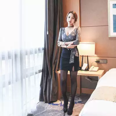 Autumn dress Long-sleeved slim-fitting hip temperament tight women's short skirt V-neck skirt be careful with machine femininity