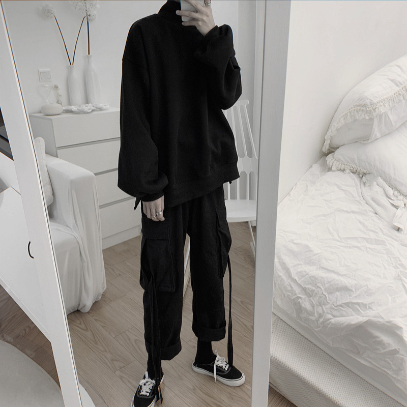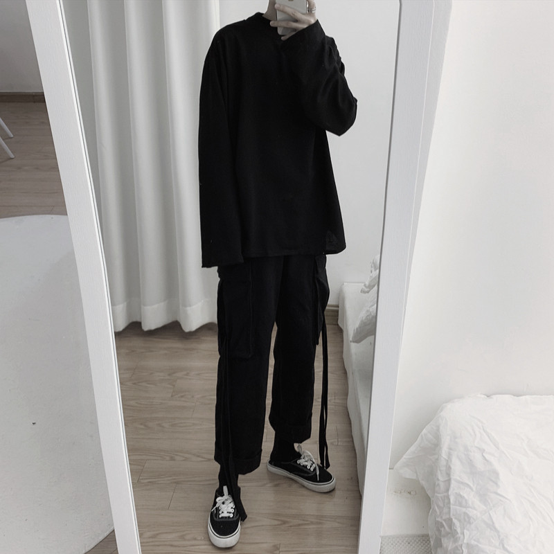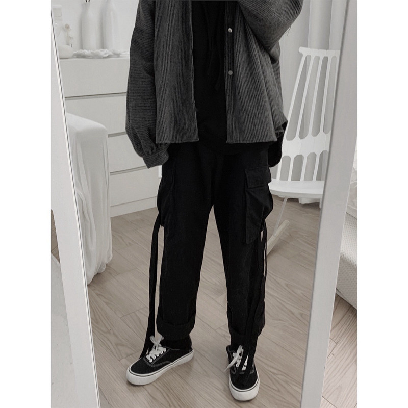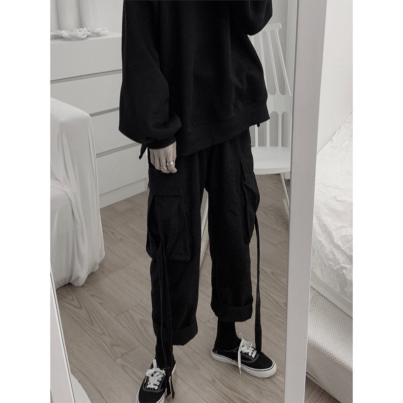 Mr short sentence retro dark black loose-leg overalls Large pockets streamers nine-point pants straight casual pants for men