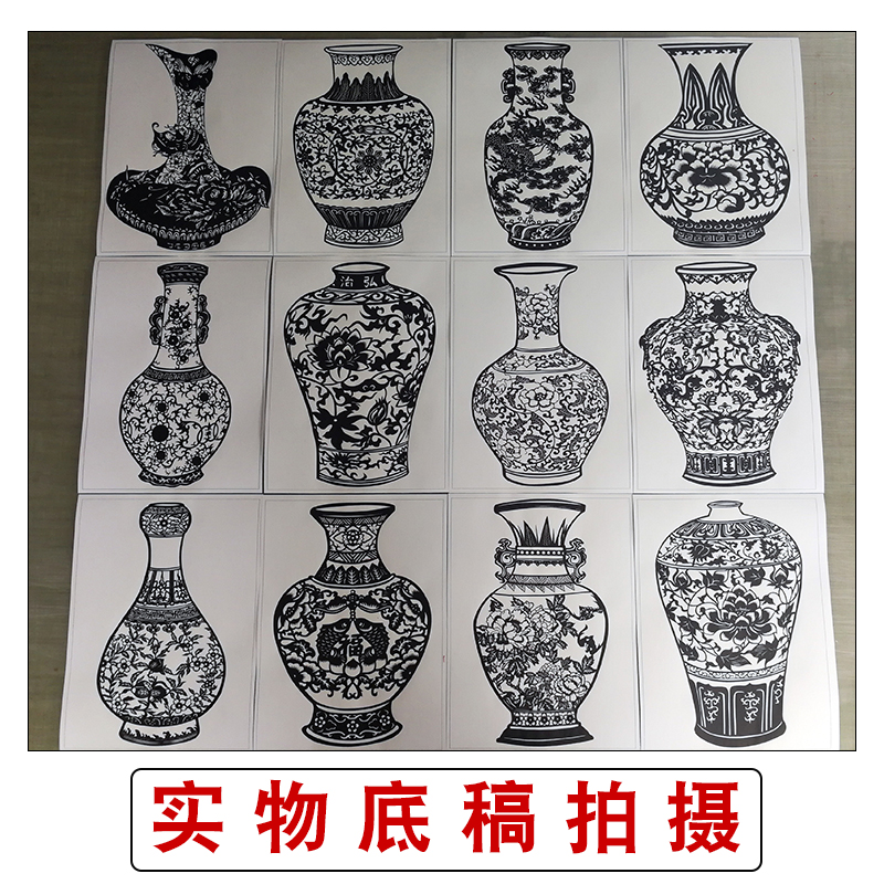 Blue and white porcelain vase paper-cut pattern black and white printing manuscript 12 high-definition Chinese style handmade paper carving pattern material