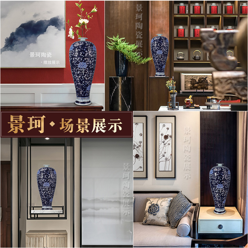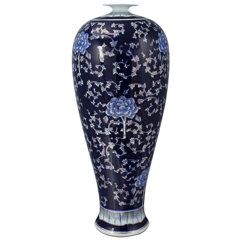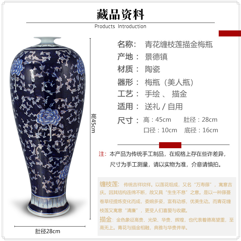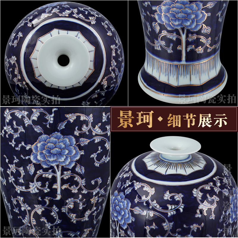 Jingdezhen blue and white porcelain high-grade hand-painted gold ceramic large vase ornament Chinese living room high-style decoration home