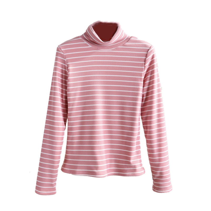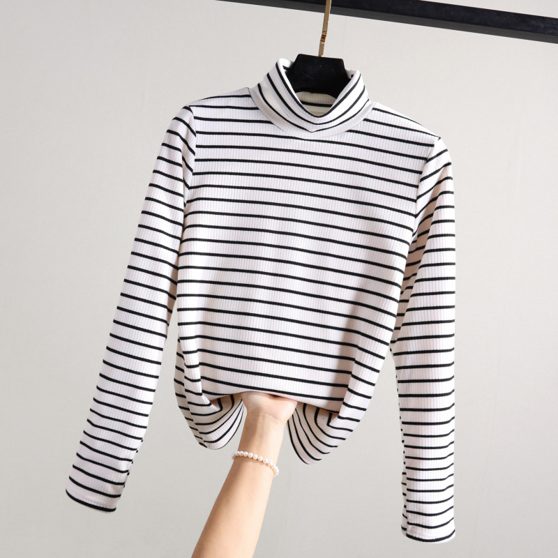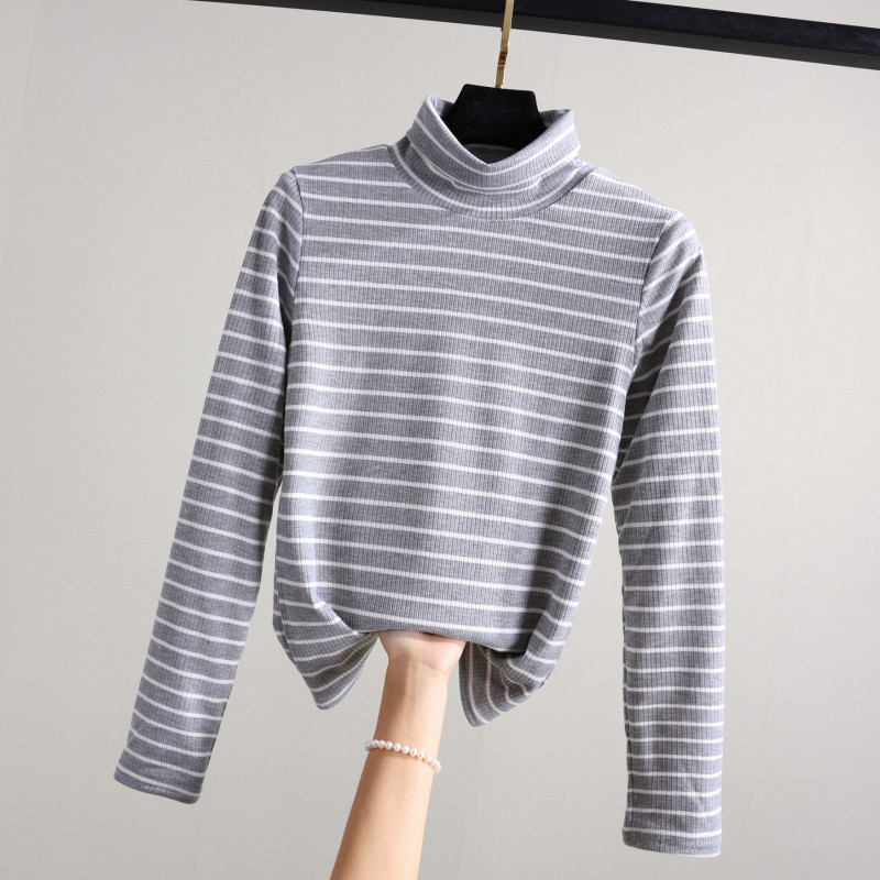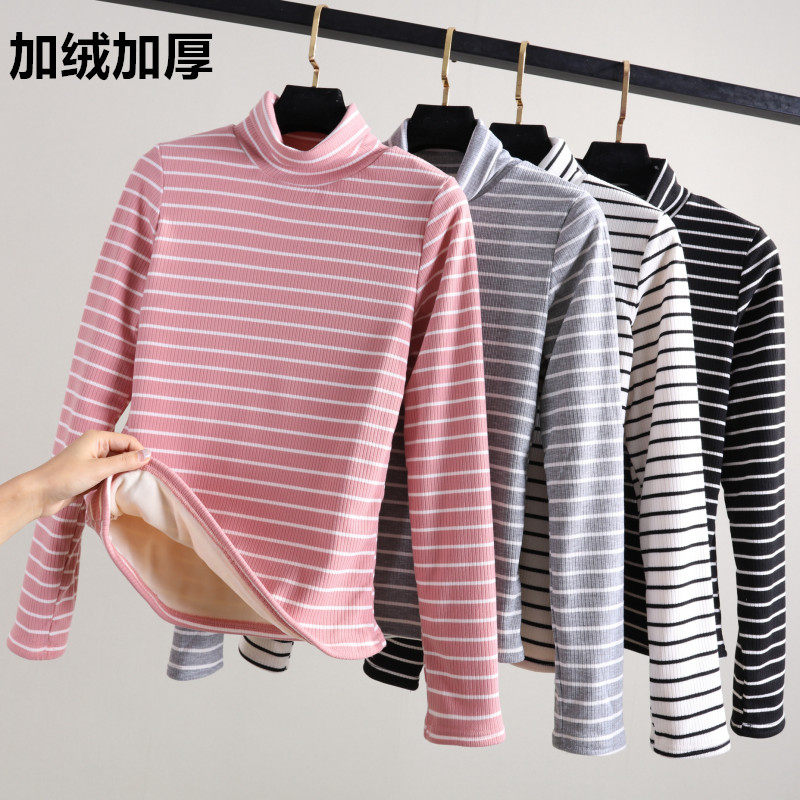 Korean version high-neck striped T-shirt women's long-sleeved autumn and winter plus velvet thick cotton all-match slim bottoming shirt women's velvet top