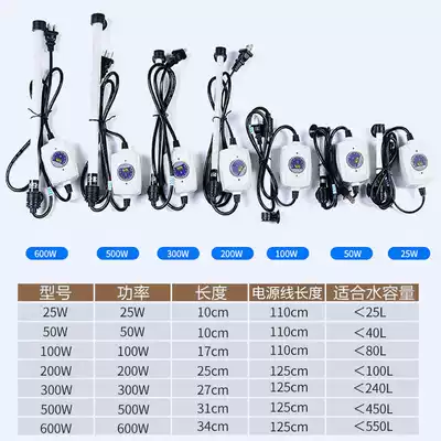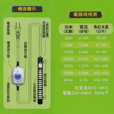 25W (suitable for 13-25 liters of water) 50W (suitable for 25-50 liters of water) 100W (suitable for 50-100 liters of water) 200W (suitable for 100