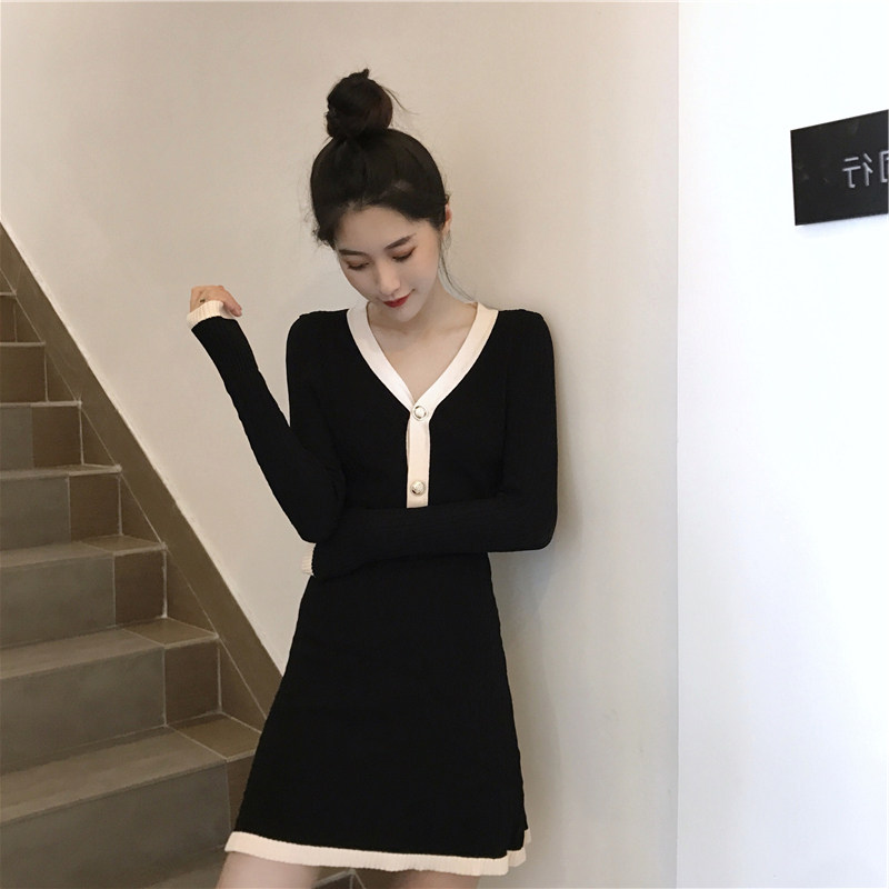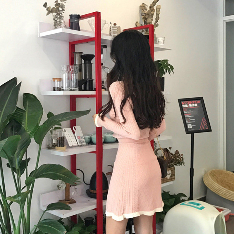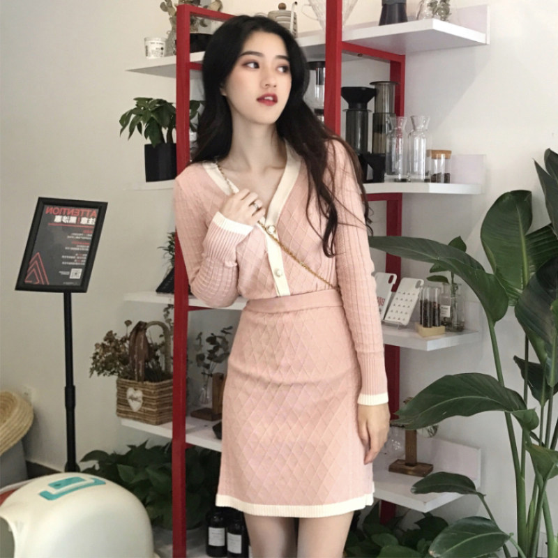 HSW long sleeve knitted suit woman two sets 2021 new autumn clothing V collar display slim fashion temperament with bottom skirt