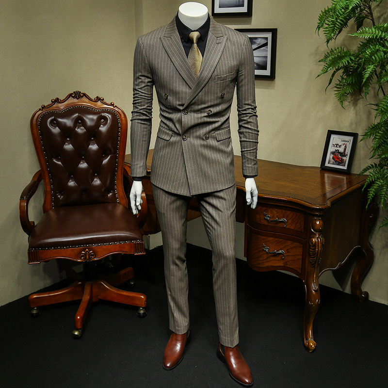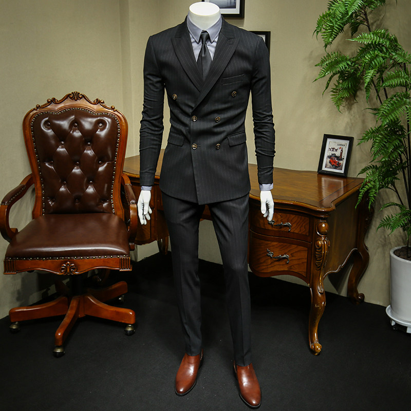 136524 European and American double-row buttoned striped wedding suit men suit the groom to fix the Korean version of the Inn Wind personality trend