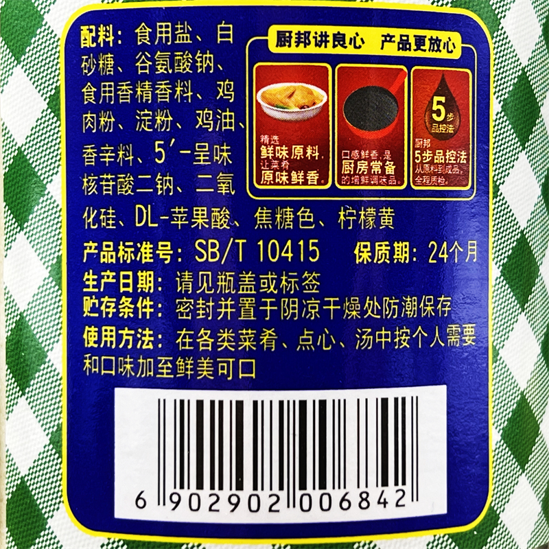 Edible salt, sugar, sodium glutamate, flavors, flavors, chicken powder, starch, chicken oil, spice, 5-flavor, nucleotide disodium, silicon dioxide, DL-malic acid, caramel color, lemon yellow