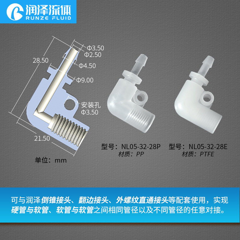 Runze plastic joint PTFE joint Soft and hard pipe butt right angle elbow 1 4-28 internal teeth quick screw joint