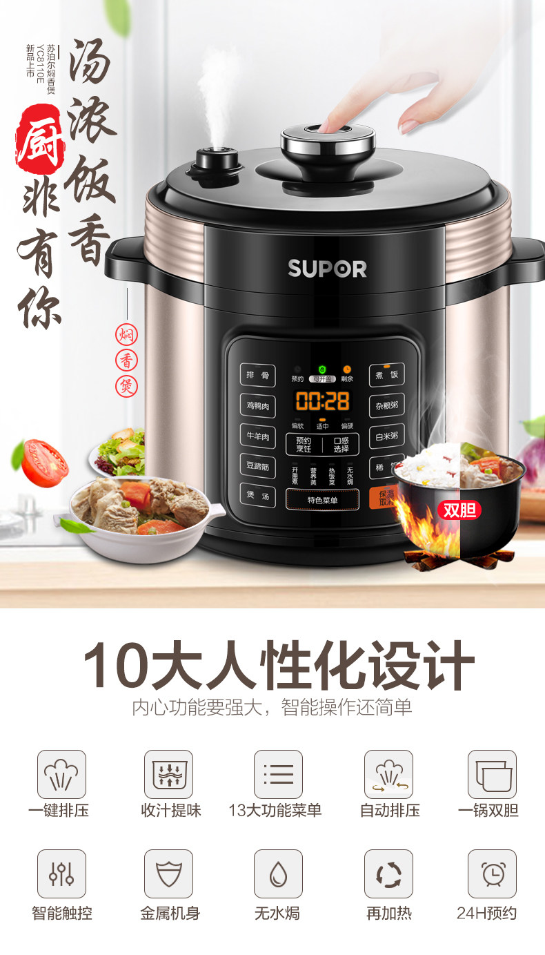 Supor safe electric pressure cooker is easy to use, large panel, energy-saving cooker, open the lid, collect juice, high heat, fast heat, one-key exhaust pressure