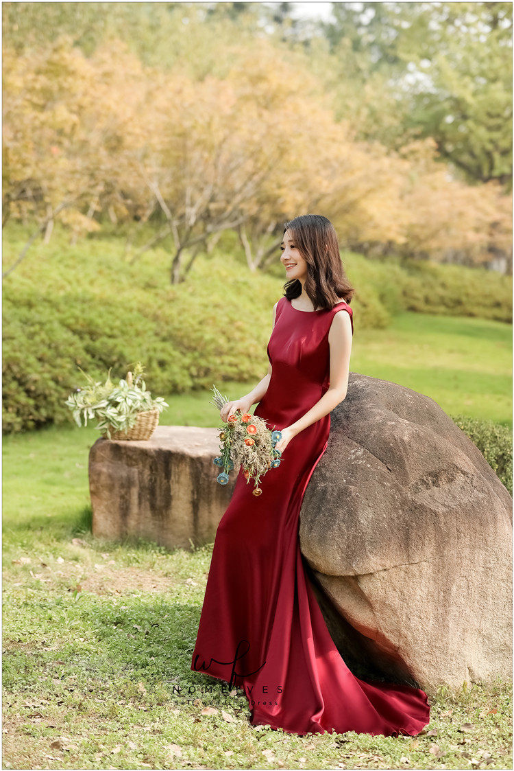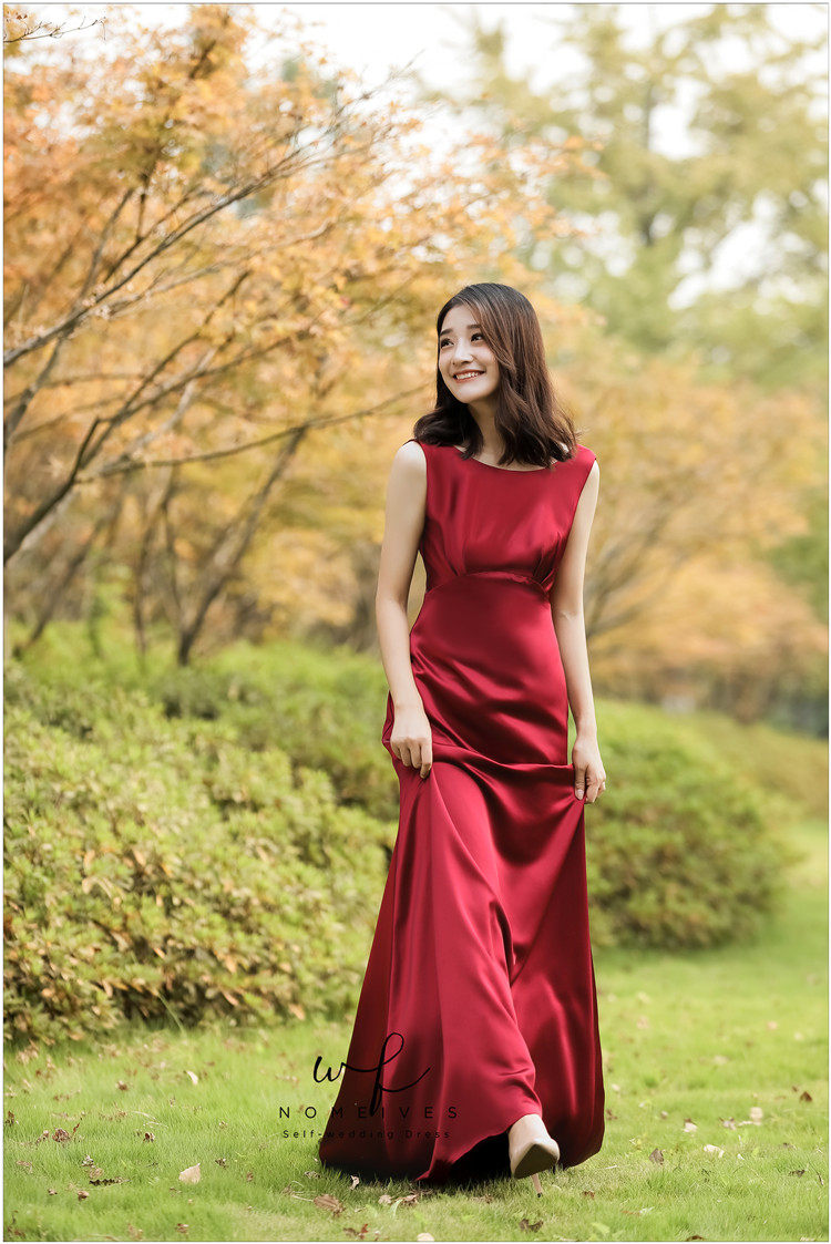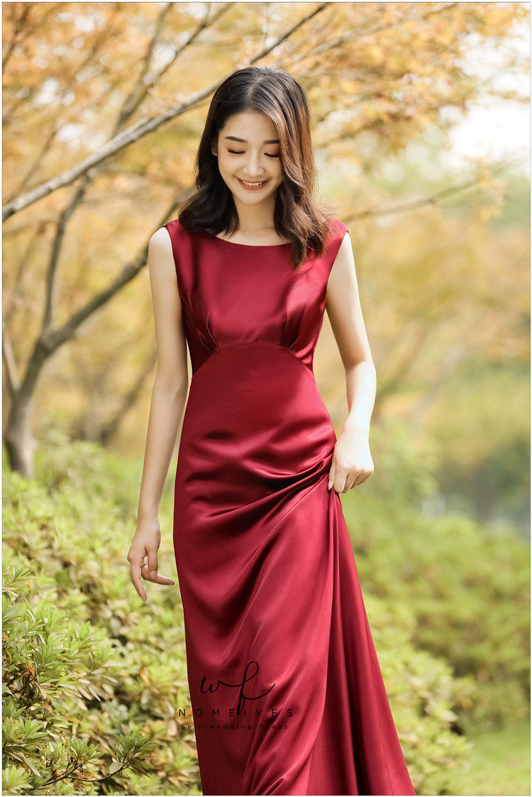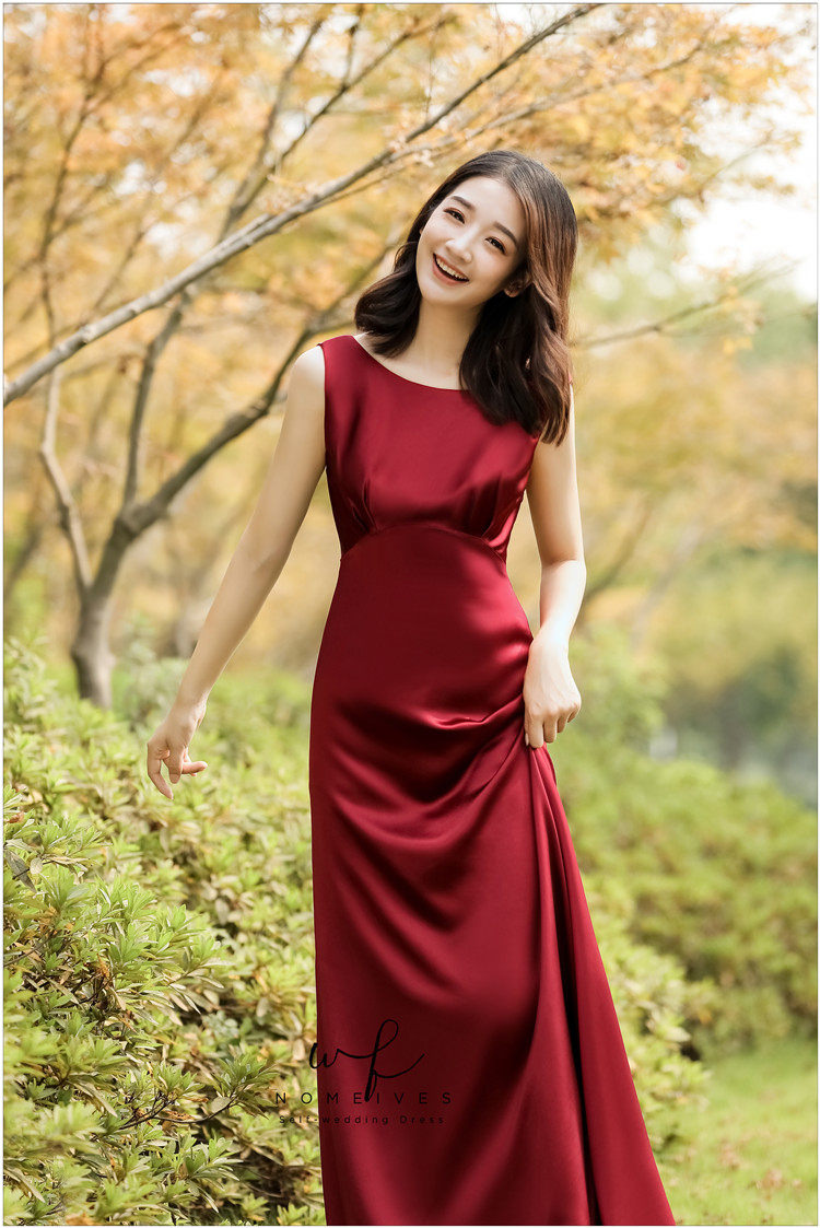 Nomeives original (Miss Downton) wine red satin toast dress wedding banquet dress travel photo gauze