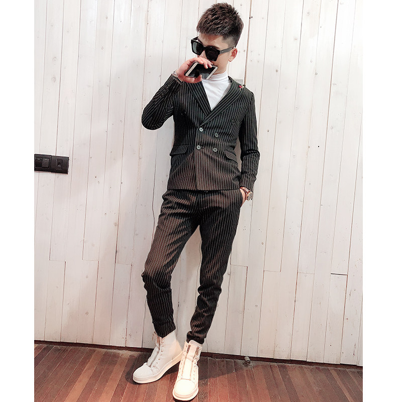 Net red with the same suit College style small suit men's double breasted striped handsome slim suit suit new tooling men