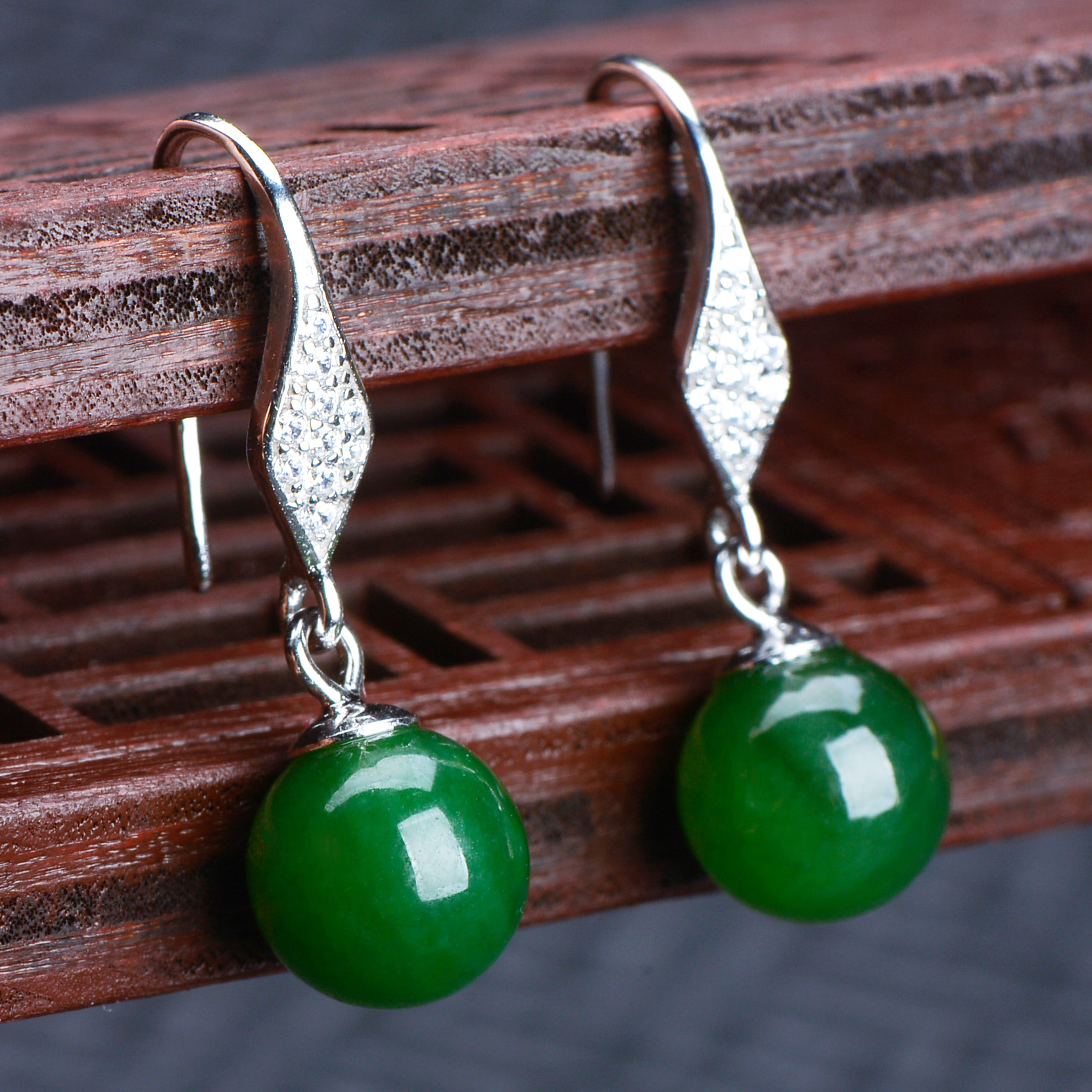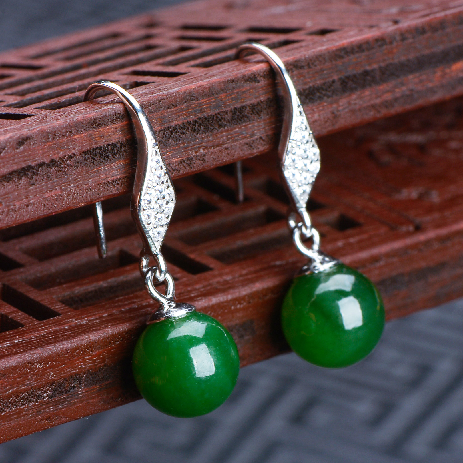 Xinjiang and Tian Yubi jade pendant s925 silver ear hook spinach green round pearl earbuke drop brief Fashion Women's Gift