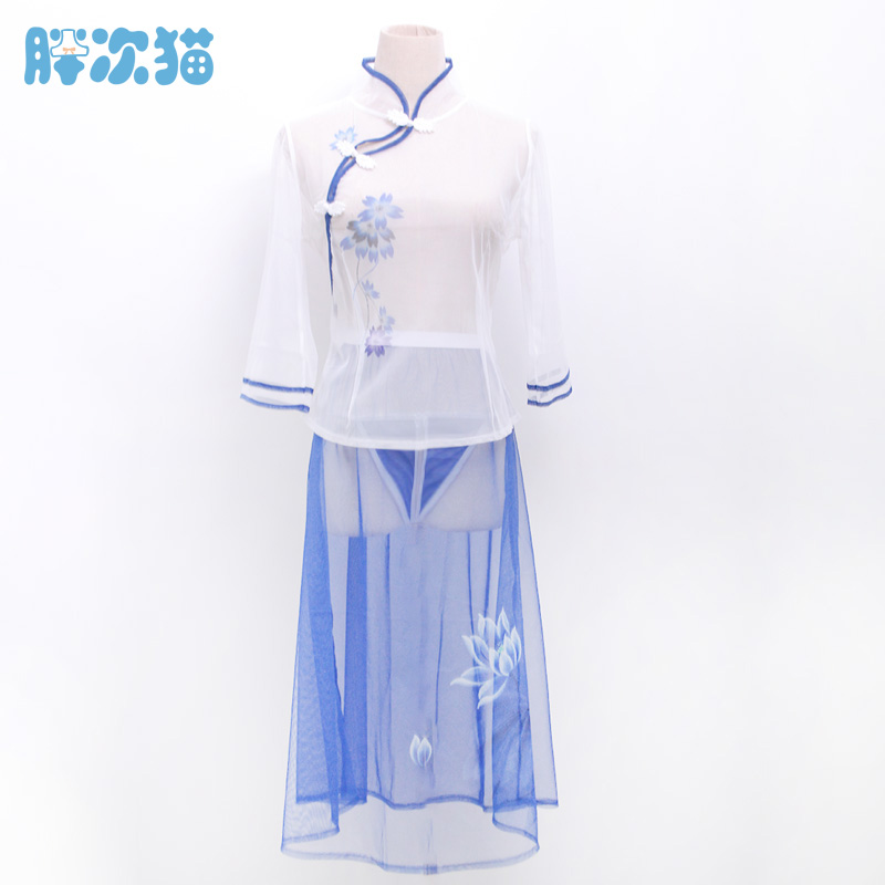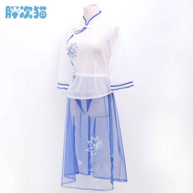 Tide index five stars Republic of China wind blue and white cheongsam nightgown sexy mesh underwear classical pajamas home clothing