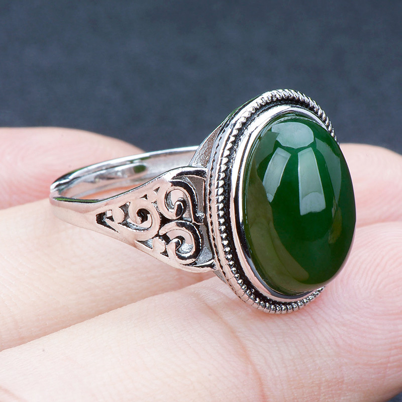 Xinjiang and Tian Yubei jade ring 925 pure silver inlaid with retro fashion women's ring living mouth minimalist ornament