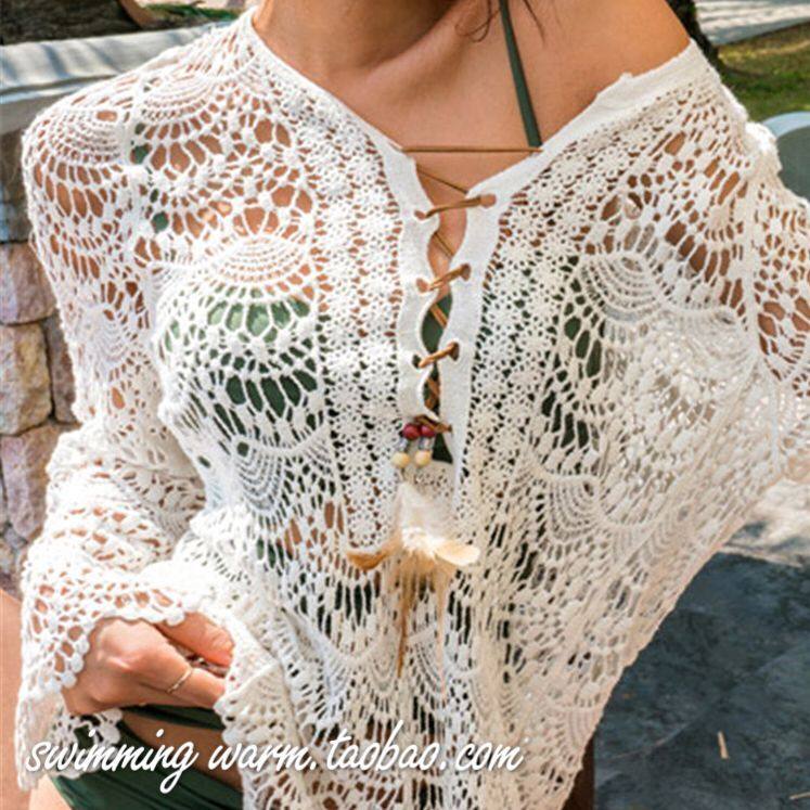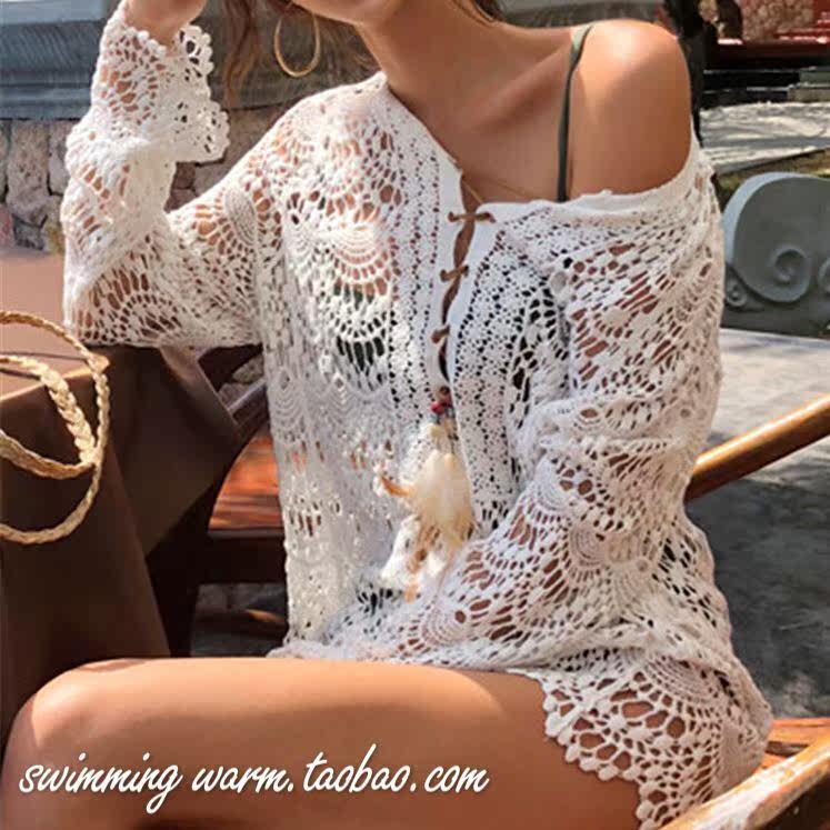 SWIMMING WARM White Lace Cutout Maiden Resort Beach Blouse Sunscreen Seaside Swimsuit Jacket Woman