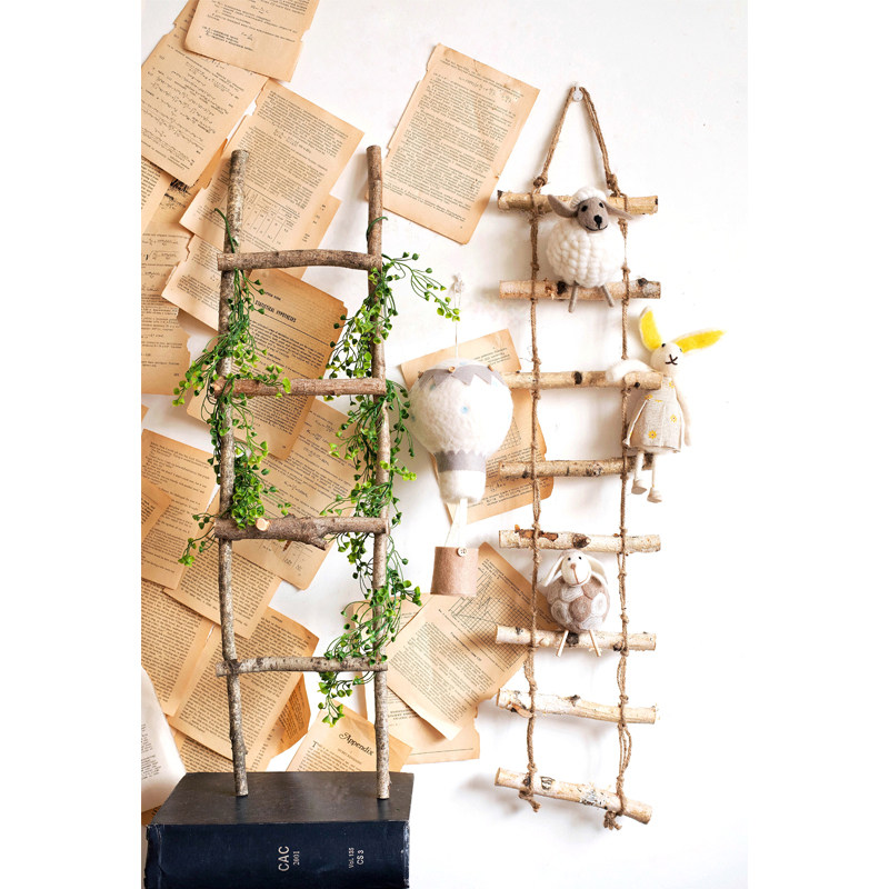 JK mousse retro natural white birch wood stick wall wall-mounted hemp rope wood ladder decorated with hanging sign hanging
