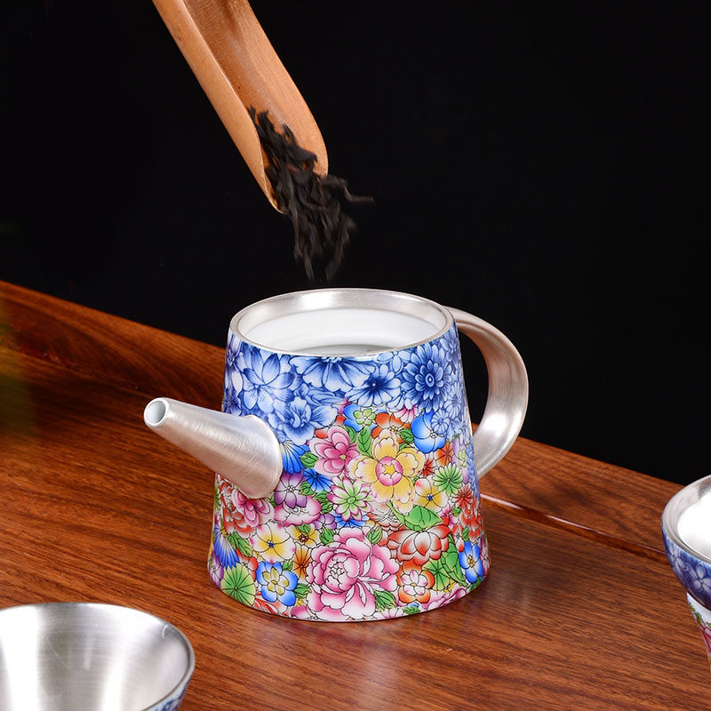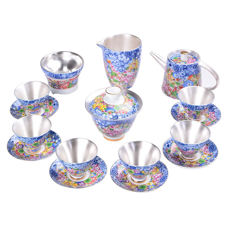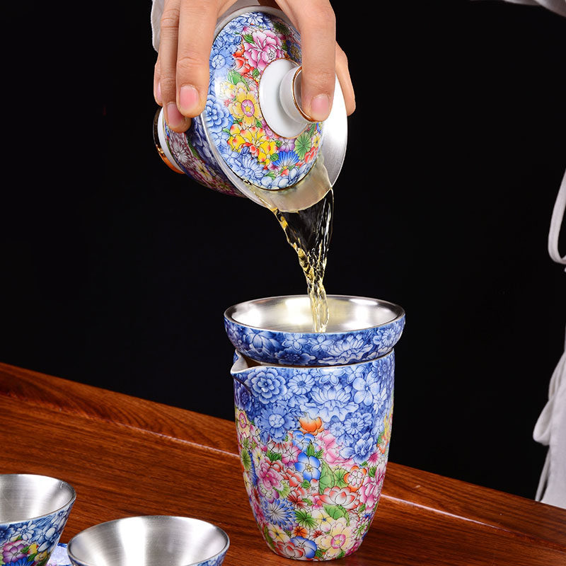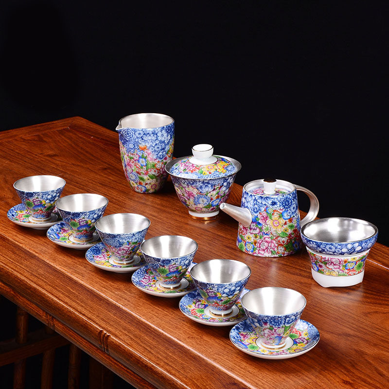 Jingdezhen Gilt silver tea set set Enamel color set Ceramic Gongfu tea set with silver cover bowl Teapot Teacup coaster