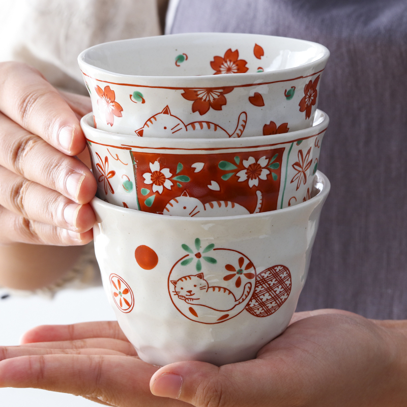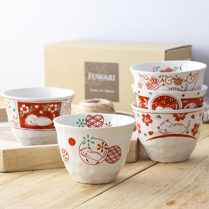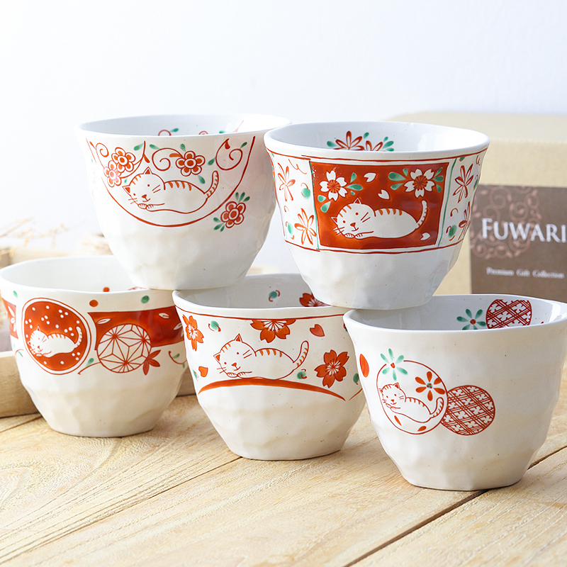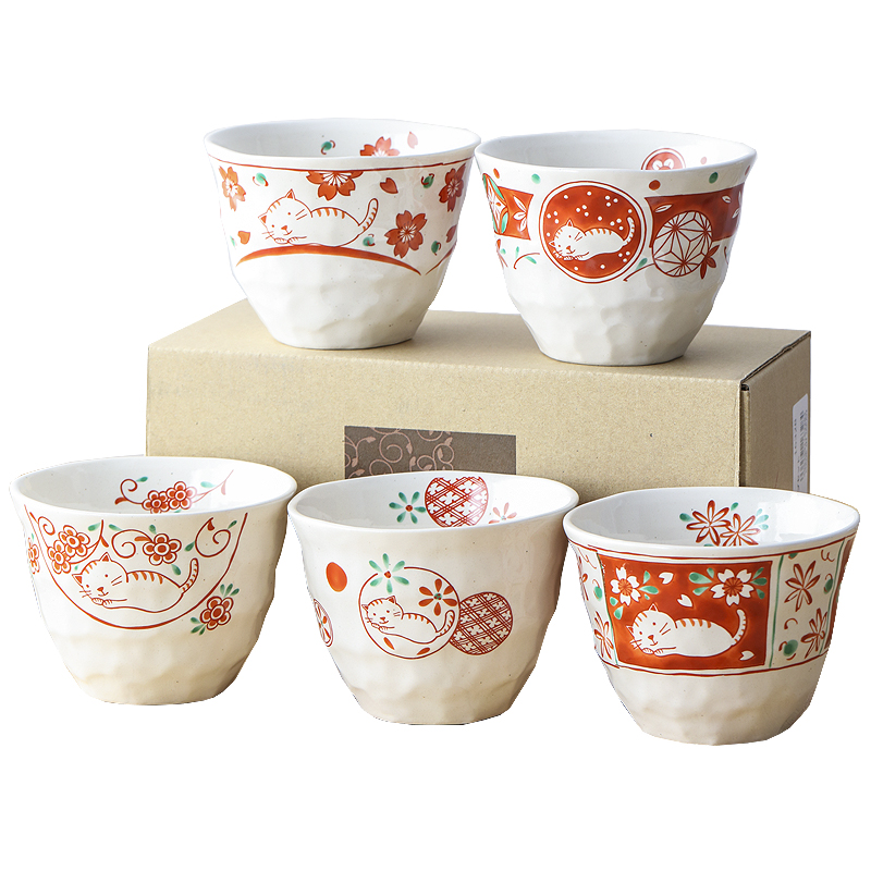 (Set of 5) Japan Imported Bloom Ceramic Teacup Coffee Cup Japanese Style Underglaze Color Red Painted Cherry Blossom Cat Water Cup