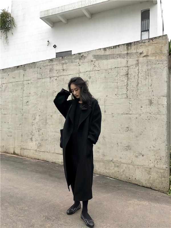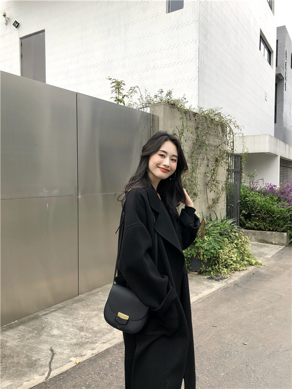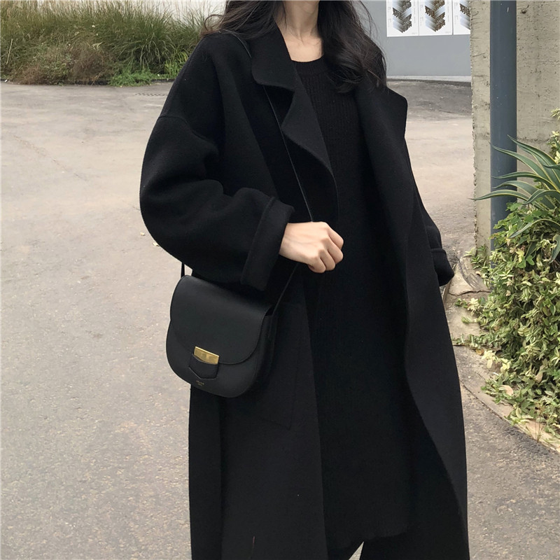 Double-sided cashmere coat women's long version loose silhouette Korean handmade lace-up wool coat thickened wool coat