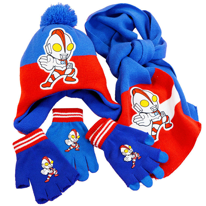 Ultraman plus velvet hat scarf gloves three-piece set half cut children's knit ear protector outdoor autumn winter Christmas gift