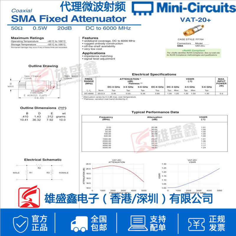 Mini-Circuits VAT-20 DC-6GHz 20dB radio frequency coaxial fixed attenuator 1W SMA