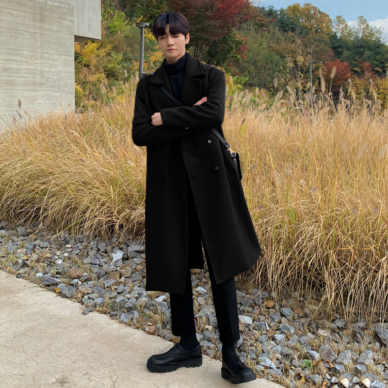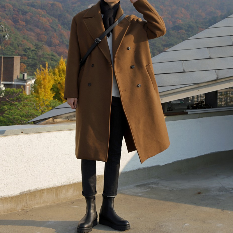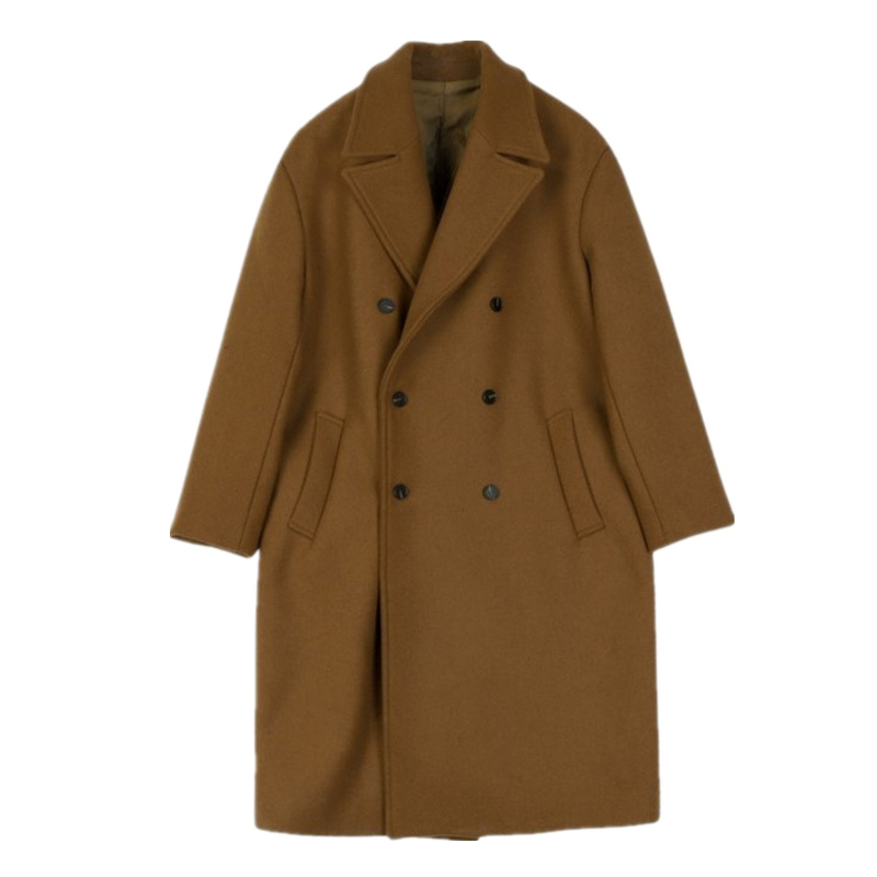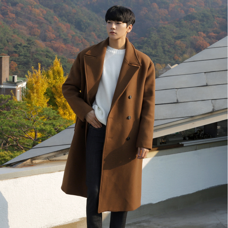 Winter wool coat men's long version over the knee loose cashmere trench coat men's Korean version of the trend brown double row coat