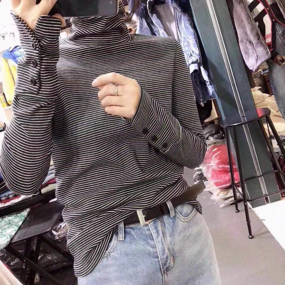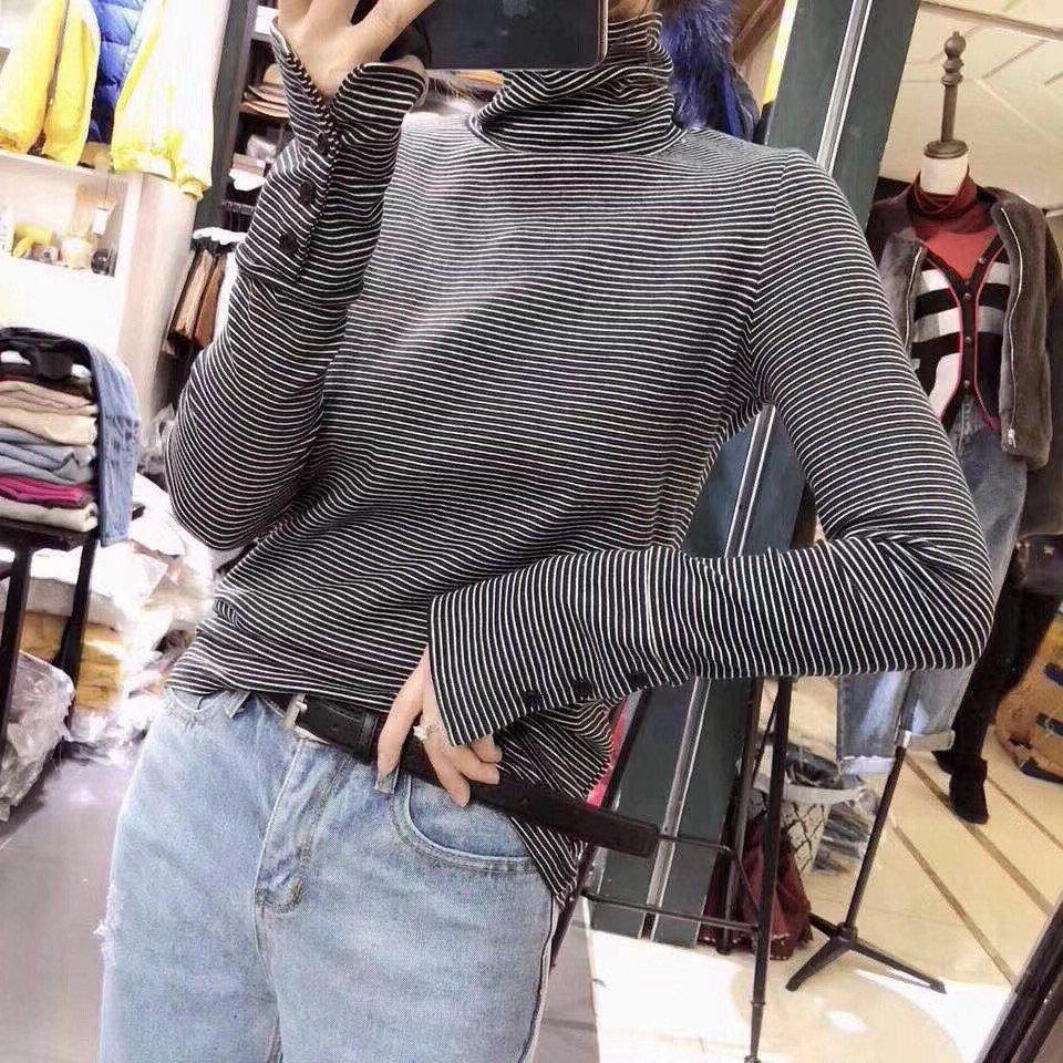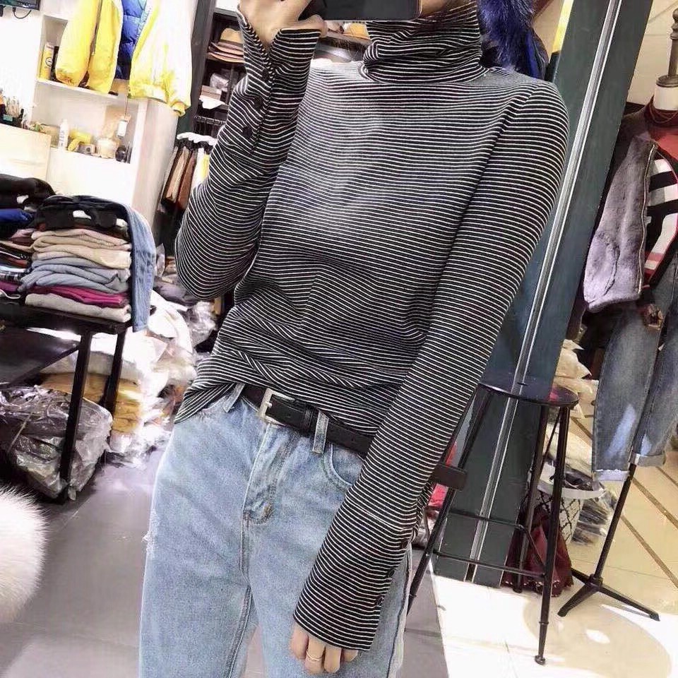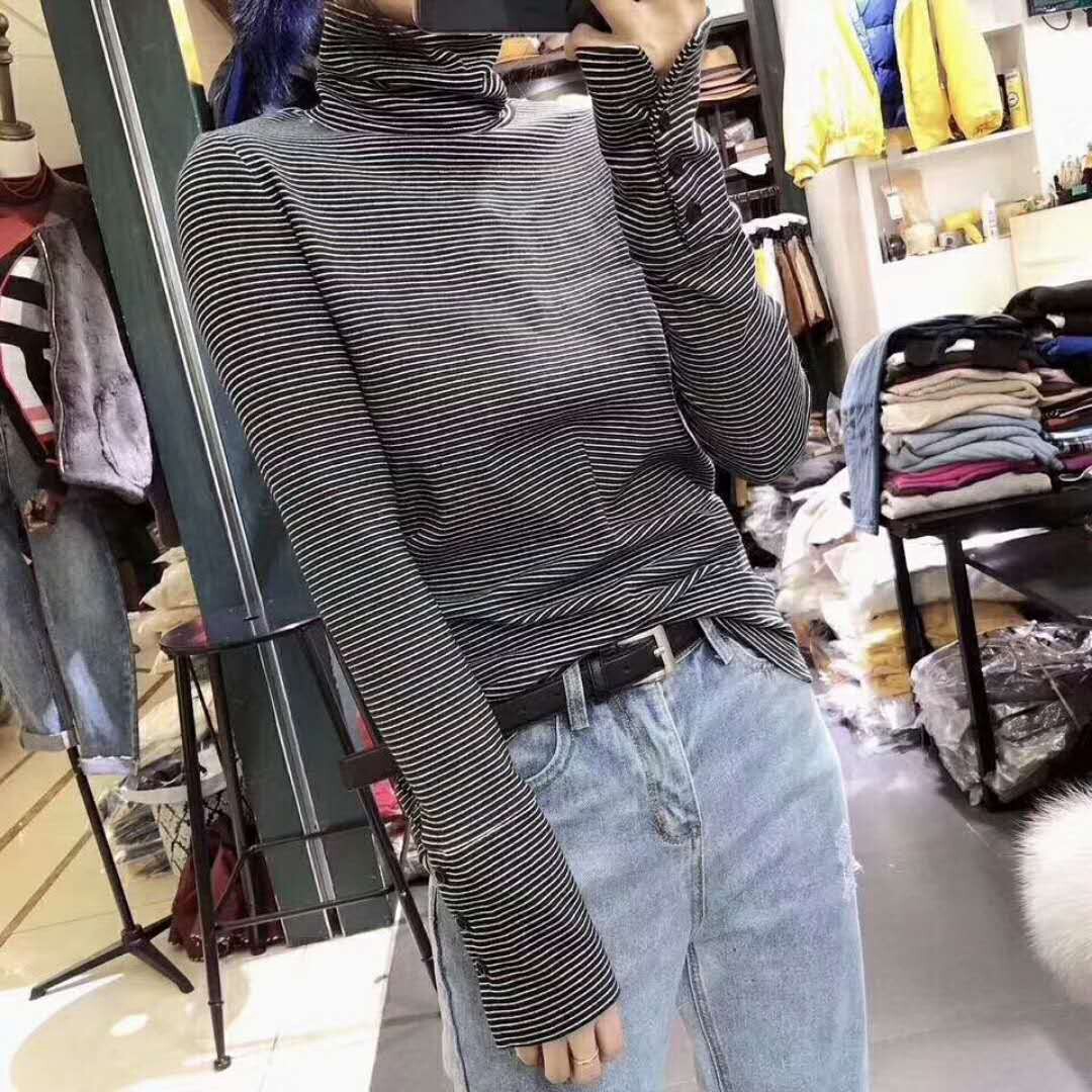 Pregnant women's high-neck base shirt women's spring and autumn and winter Korean version of long-sleeved striped knitted T-shirt plus velvet top tide Mom