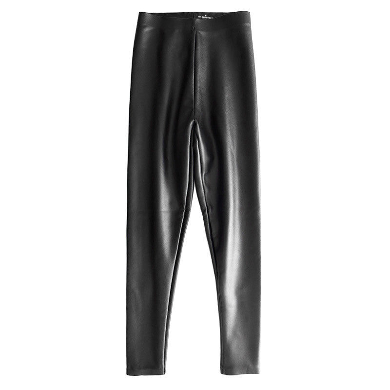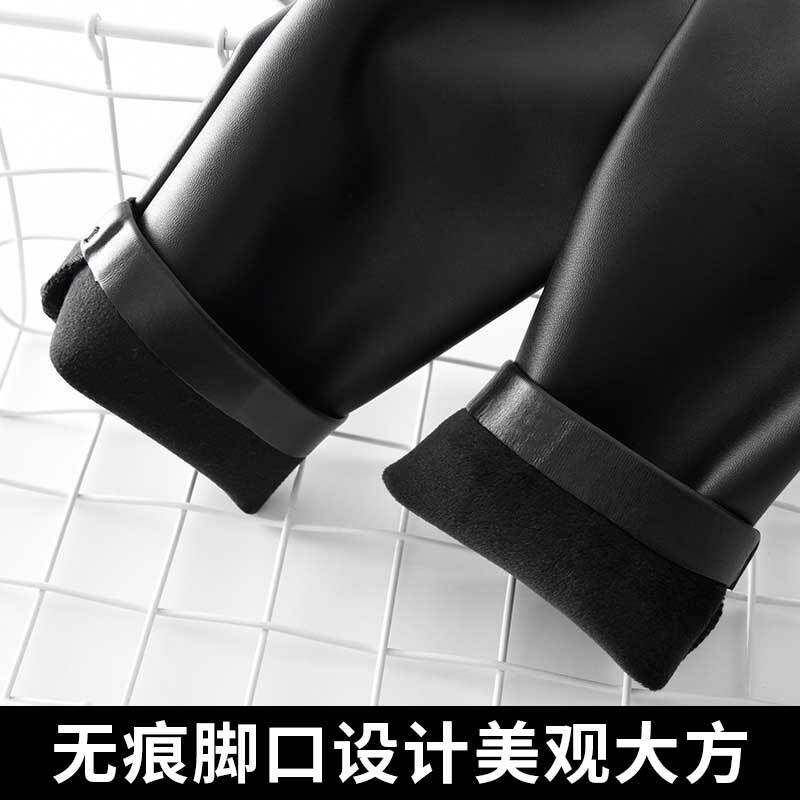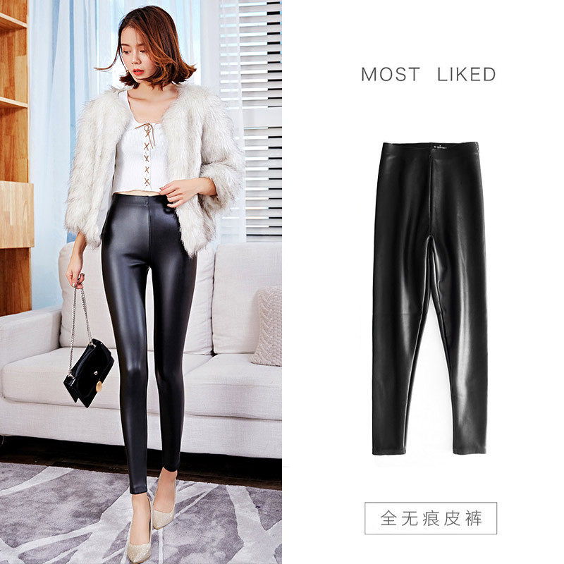 New autumn and winter fake mother trousers PU traceless leather trousers matte high waist wearing thickened and plush nine cent leggings