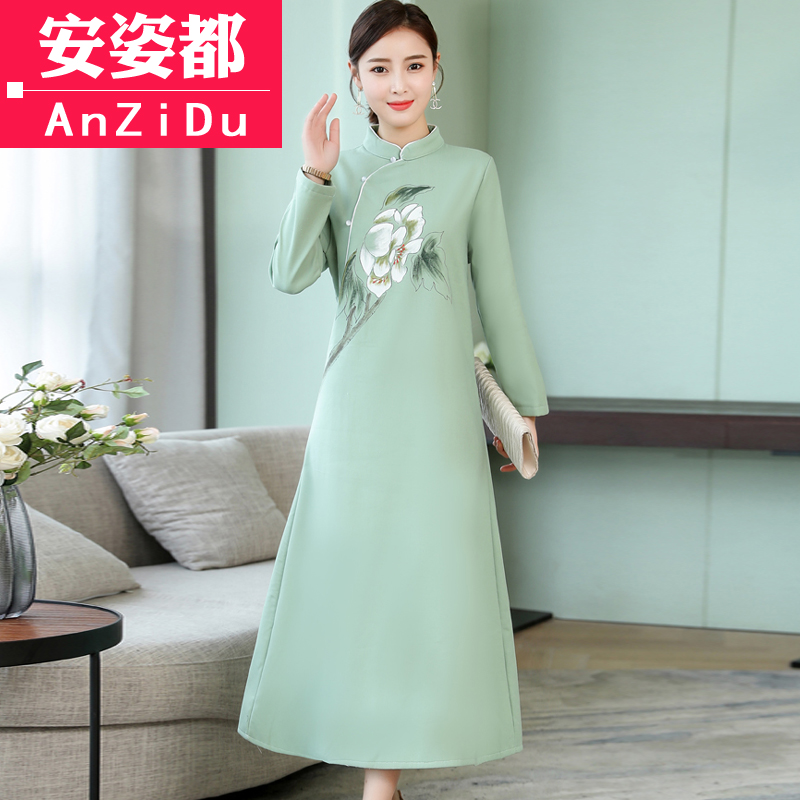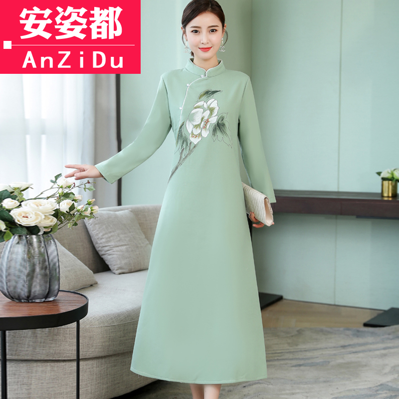 Tea Suit Woman Autumn Winter China Mannequin Woman Dress Thickened Cotton Linen Long Sleeve Qipao Dress Retro Long Skirt