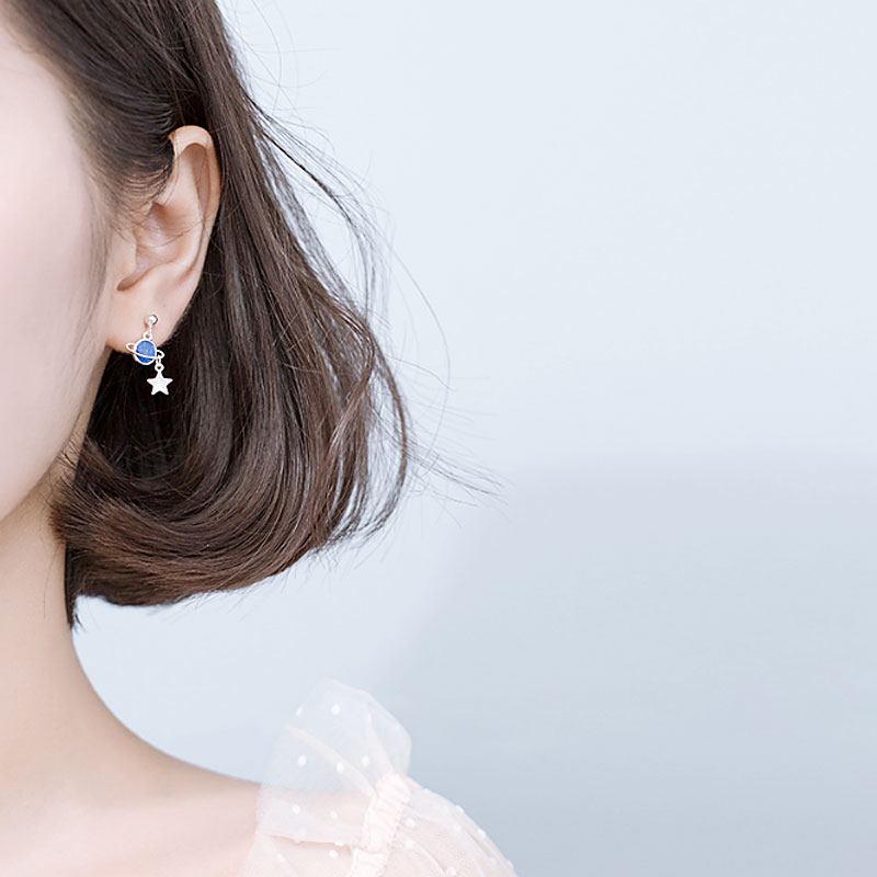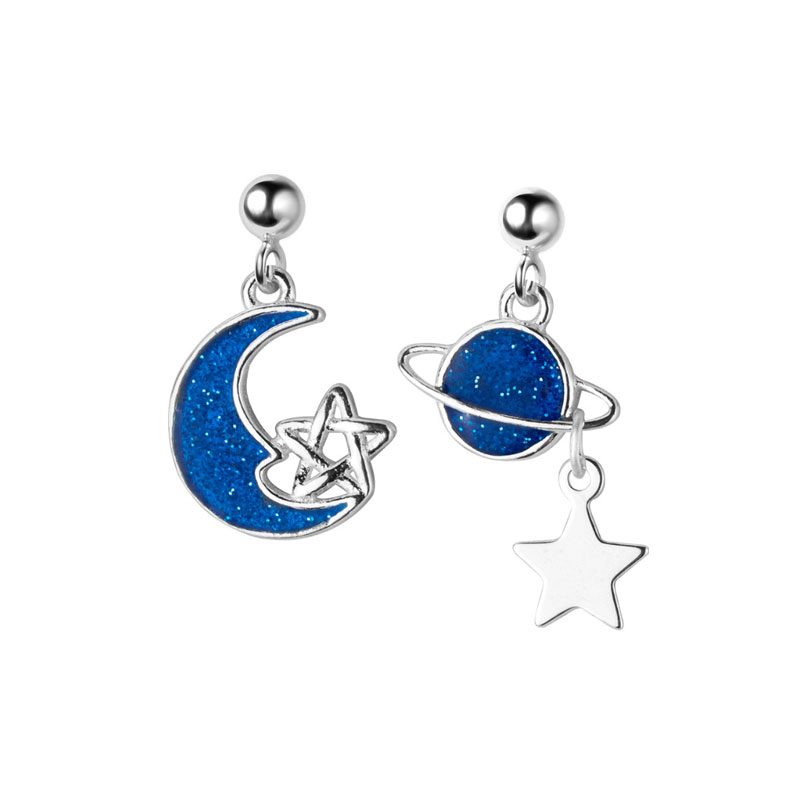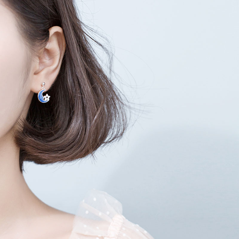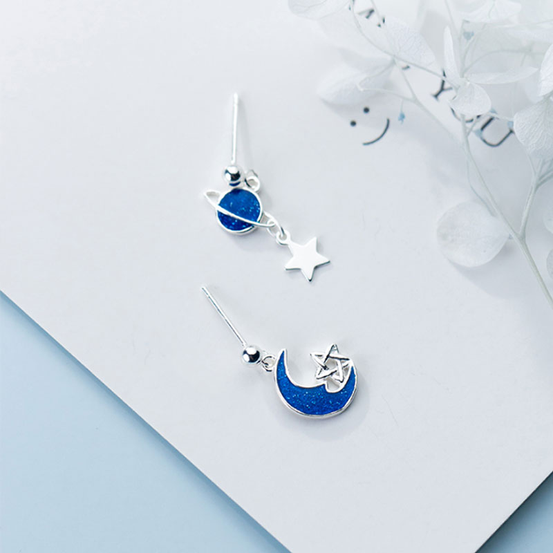 Cat sting creative universe stars moon drop glaze asymmetrical S925 sterling silver female earrings literary fresh best friend earrings