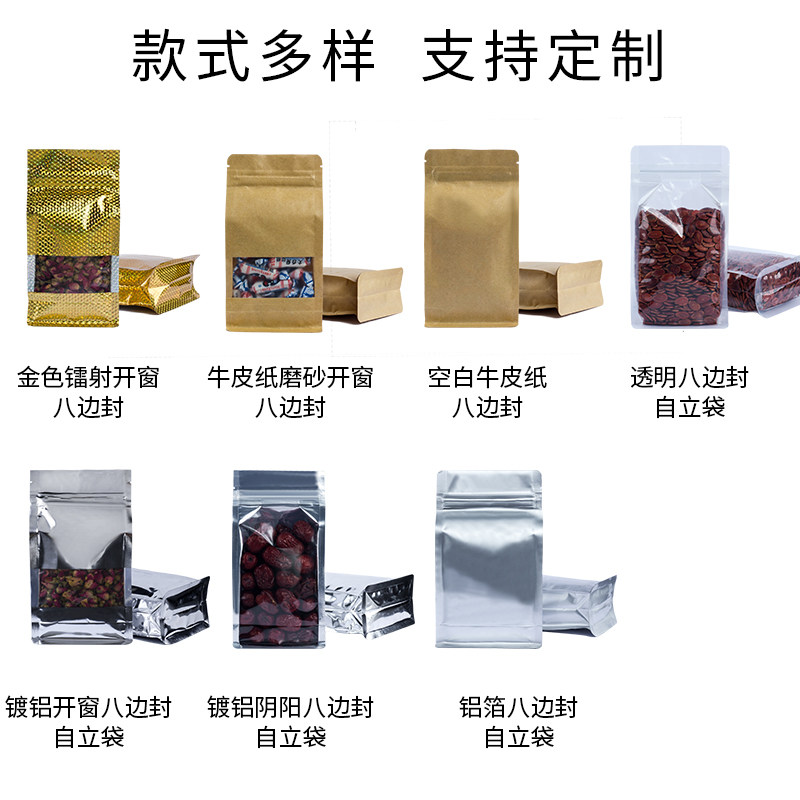 Kraft paper bag storage eight-side sealed pocket aluminum foil bag transparent self-supporting self-sealing bag tea thickened food packaging bag