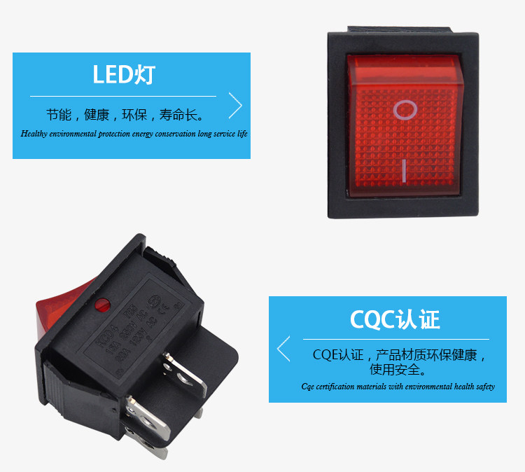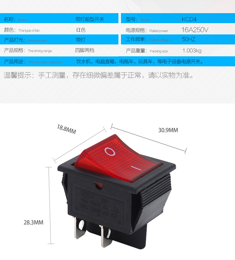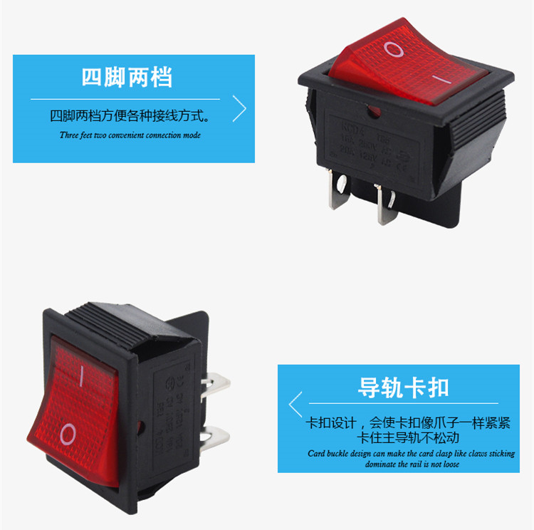 Boat type switch KCD4 boat shaped wane power button switch 2 stalls 4 feet with red light 31x25mm 16A-Taobao