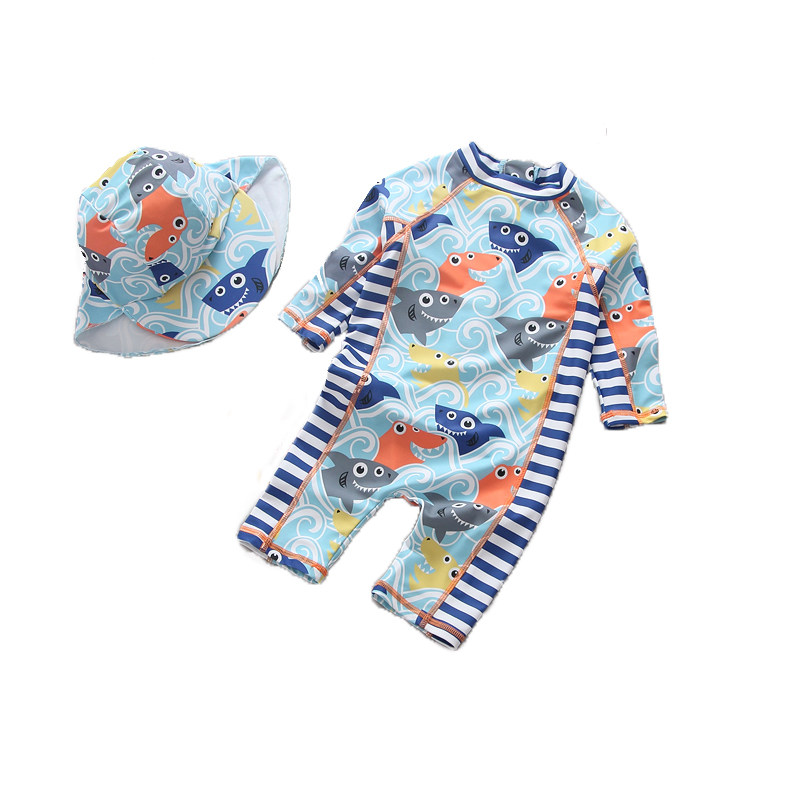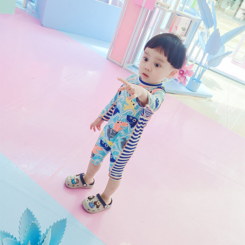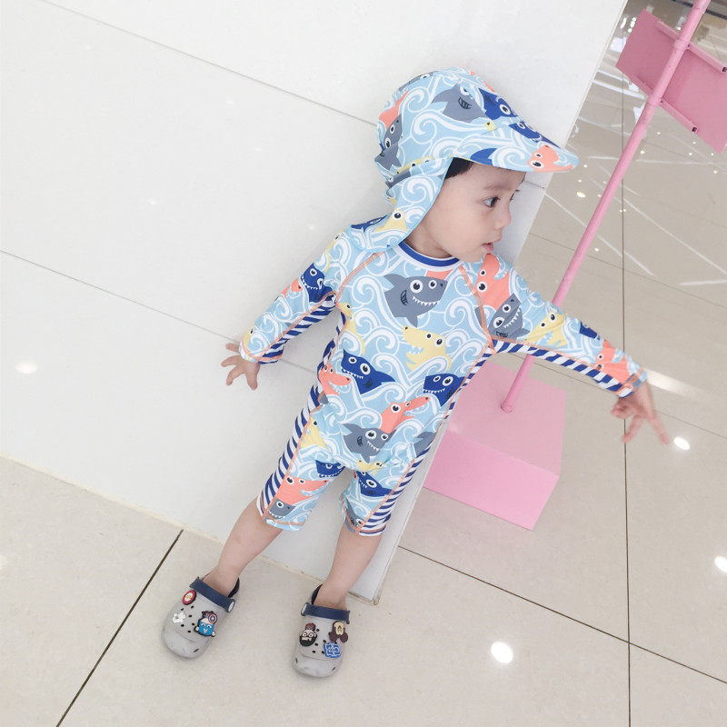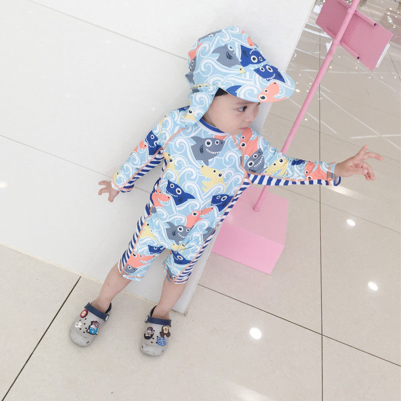 Korean sunscreen quick-drying long sleeves warm children's swimsuit boys cute shark suit baby one-piece surf suit tide