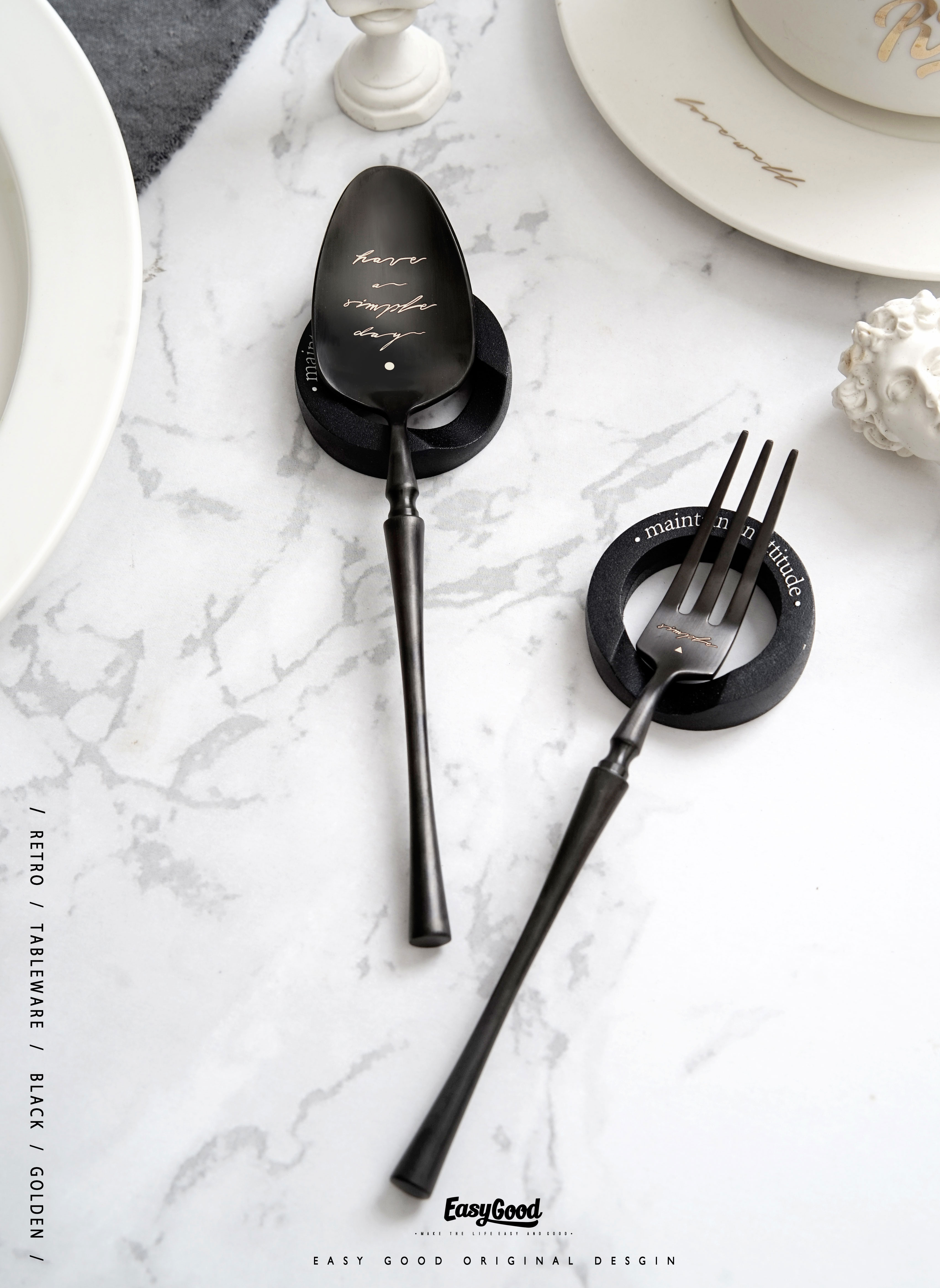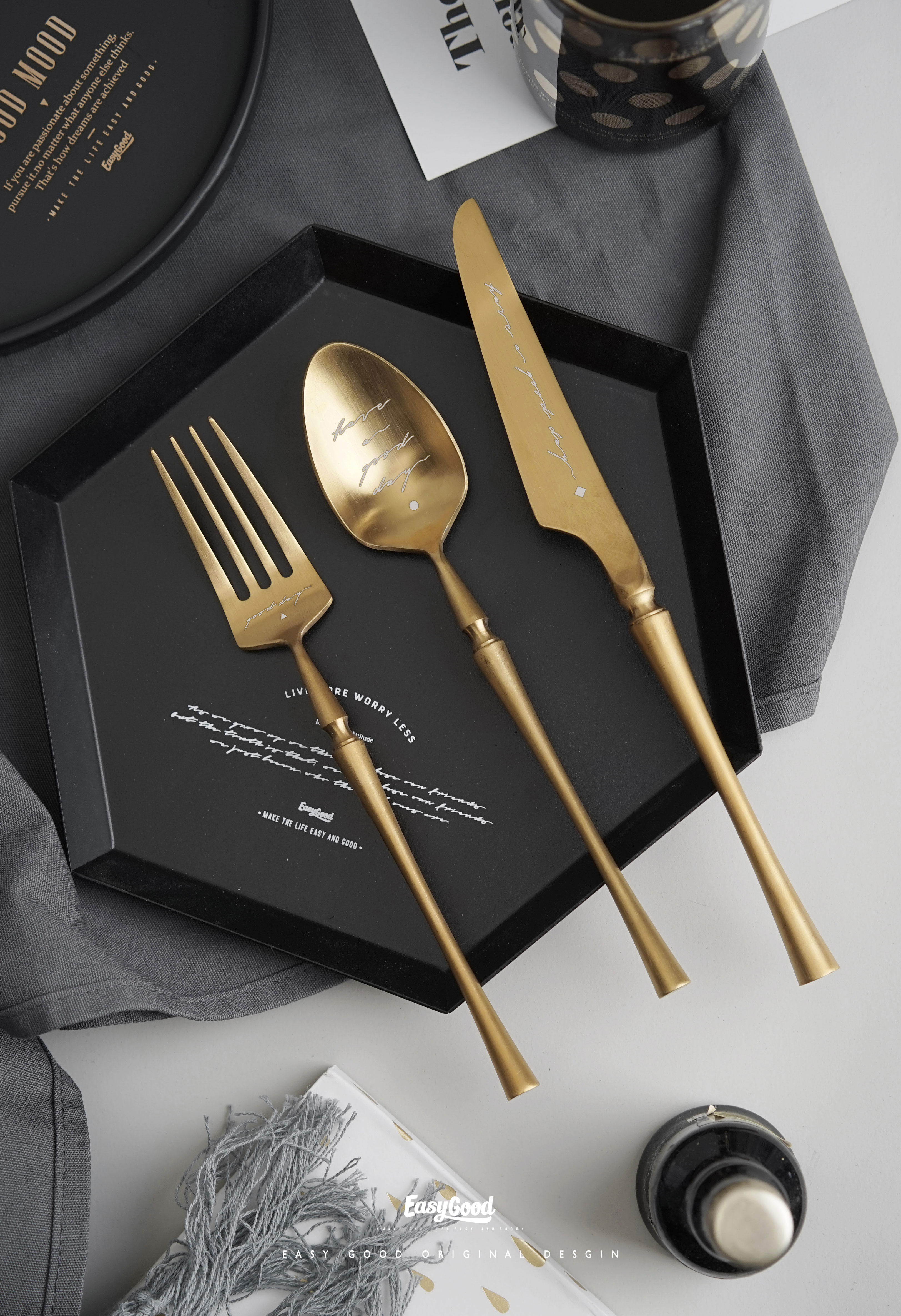 Black three-piece golden sweet fork black dessert spoon black main spoon golden dessert suit black master spoon golden dessert fork gold master knife golden master knife golden master knife