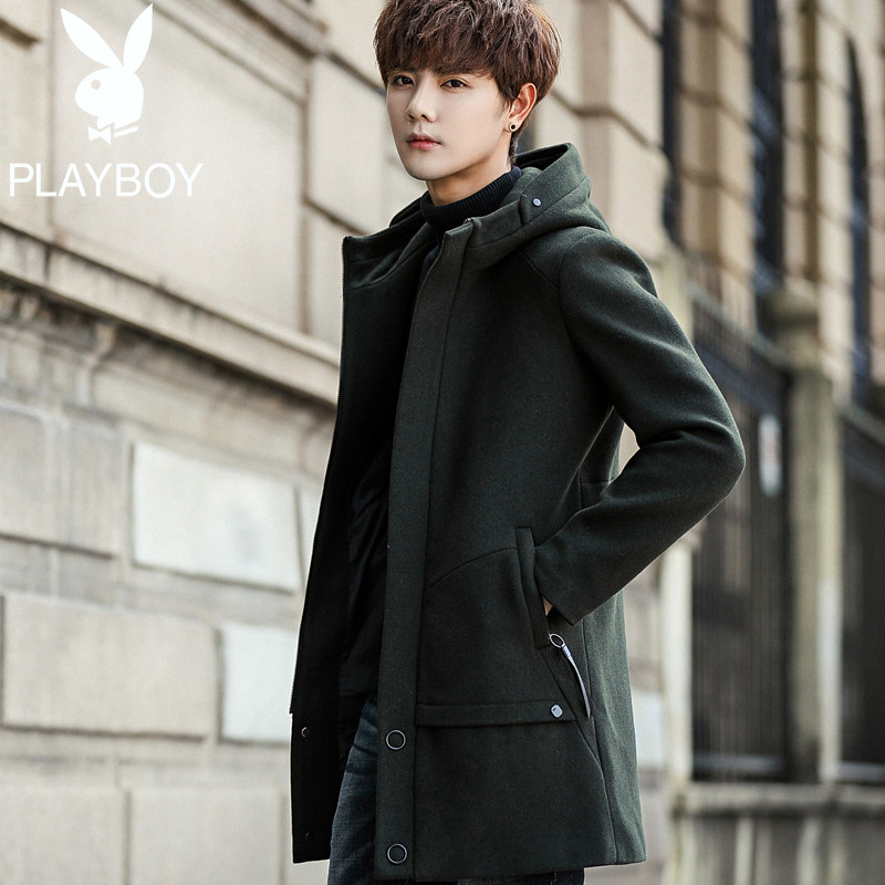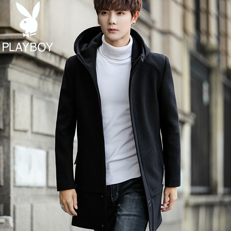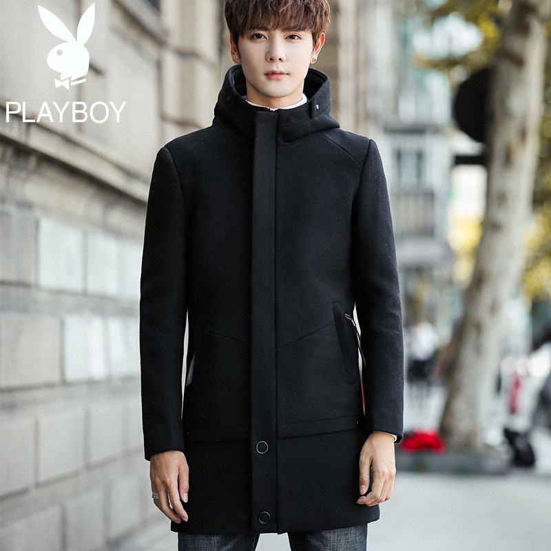 Playboy brand trench coat men's long Version 2018 winter hooded thick woolen coat men's wool coat
