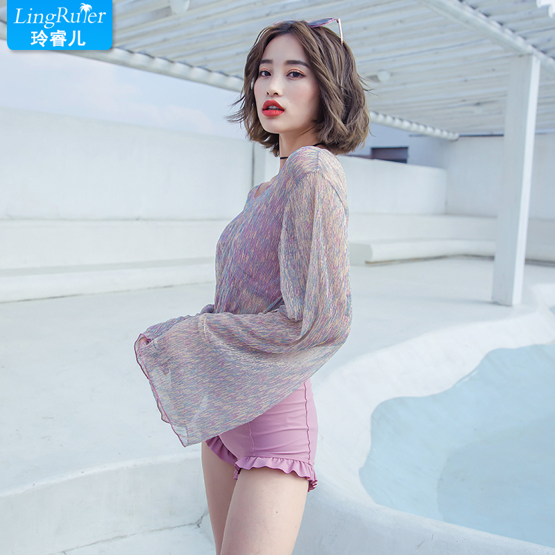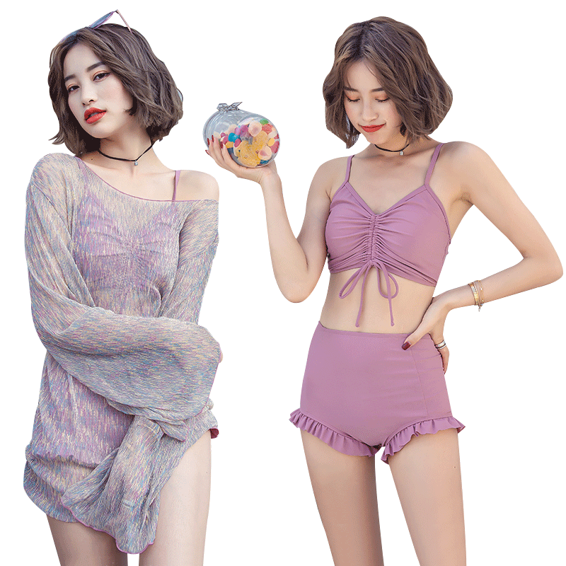 South Korea ins two-piece les swimsuit women's three-piece small chest gathered net red fairy fan conservative slim belly swimming