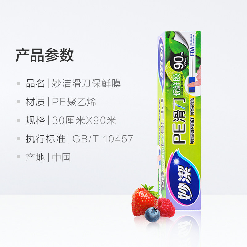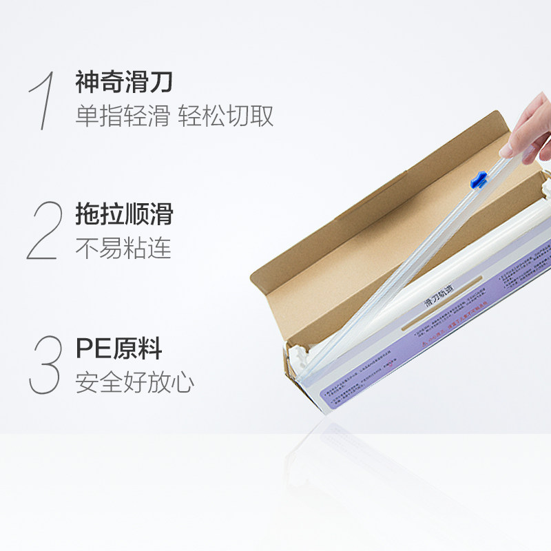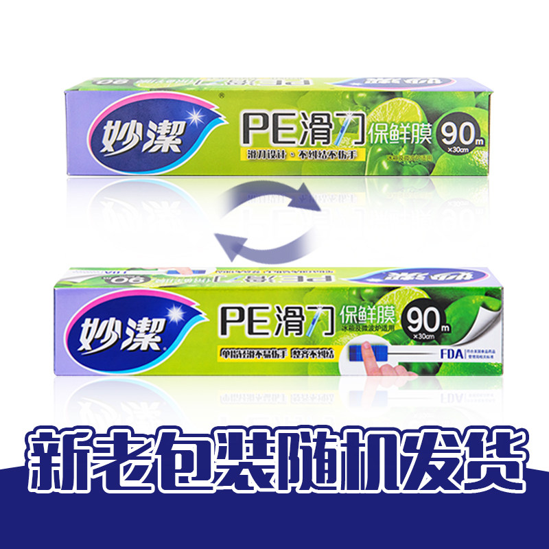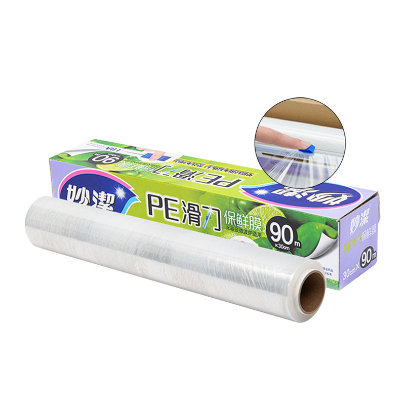 Miaojie sliding knife type PE cling film 90 meters kitchen food grade with cutter cutting machine box easy to use does not hurt hands